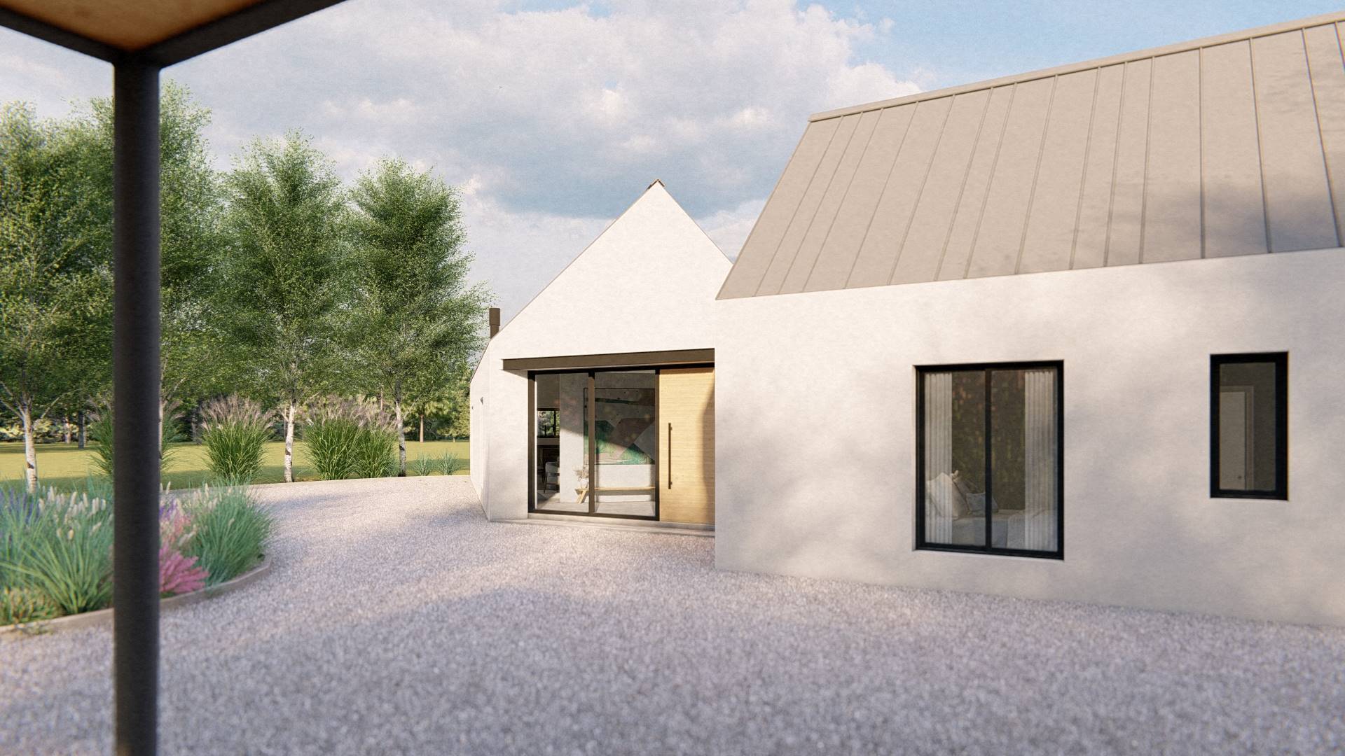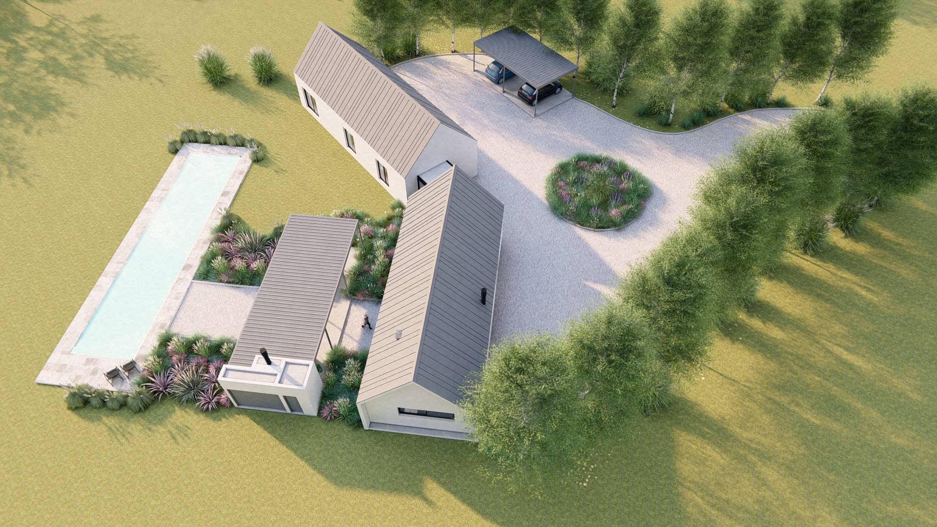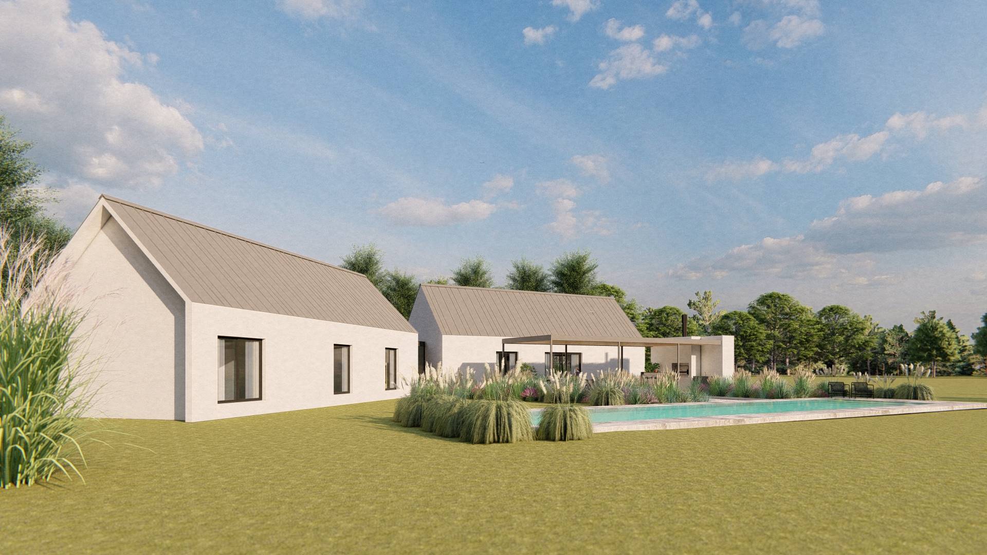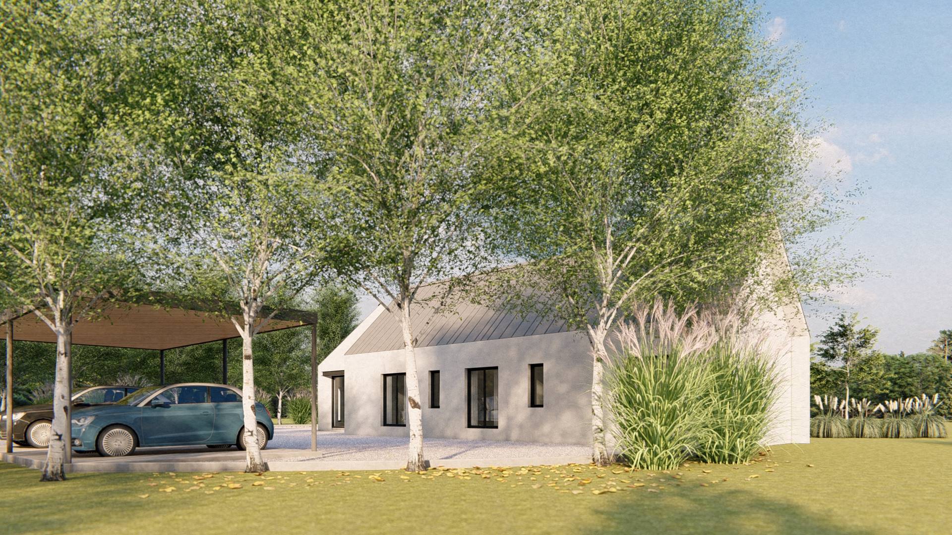 El acceso vehicular a la vivienda se desarrolla de forma orgánica, resguardado por un majestuoso sendero de álamos que brinda sombra y envuelve la casa en un cálido abrazo. Además, la residencia se encuentra rodeada de un exuberante tapiz de gramíneas y especies vegetales diversas, que fomentan un paisajismo orgánico y cambiante, en constante diálogo con el diseño espacial de la vivienda.