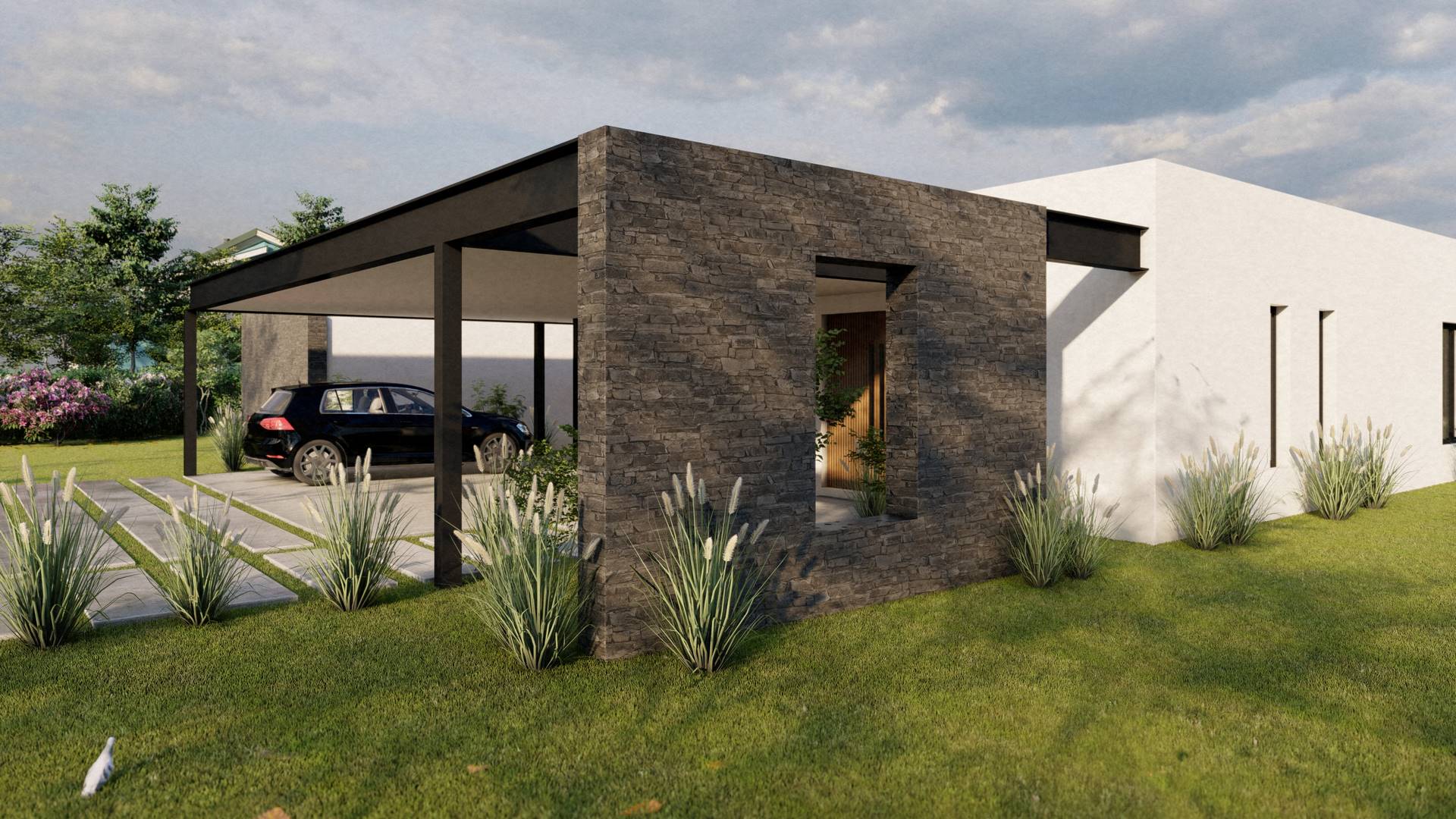 En el interior, el color blanco predominante en paredes, cielorrasos y porcelanatos amplía y aclara los espacios, aportando una sensación de luminosidad y amplitud. Los grandes ventanales enmarcados en negro, equipados con doble vidrio hermético, optimizan la iluminación y ventilación, al tiempo que acentúan la conexión visual con el entorno exterior. La fachada de la vivienda, definida por muros con revestimiento plastico en blanco y detalles sutiles en piedra gris, se complementa con una estructura metálica negra en los espacios de transición y galería, creando un diálogo armónico entre modernidad y calidez.