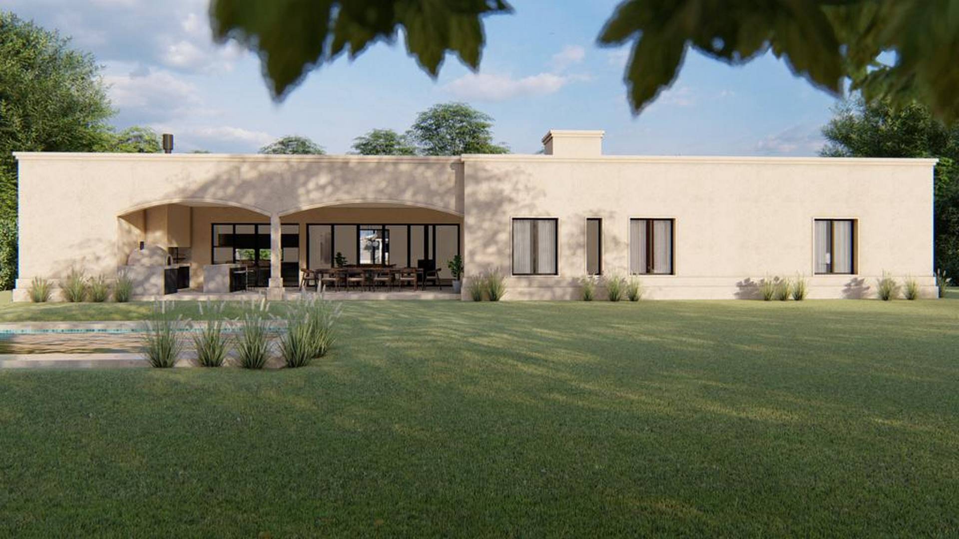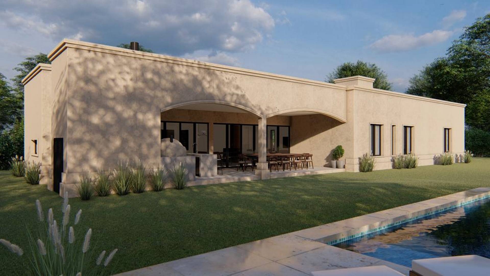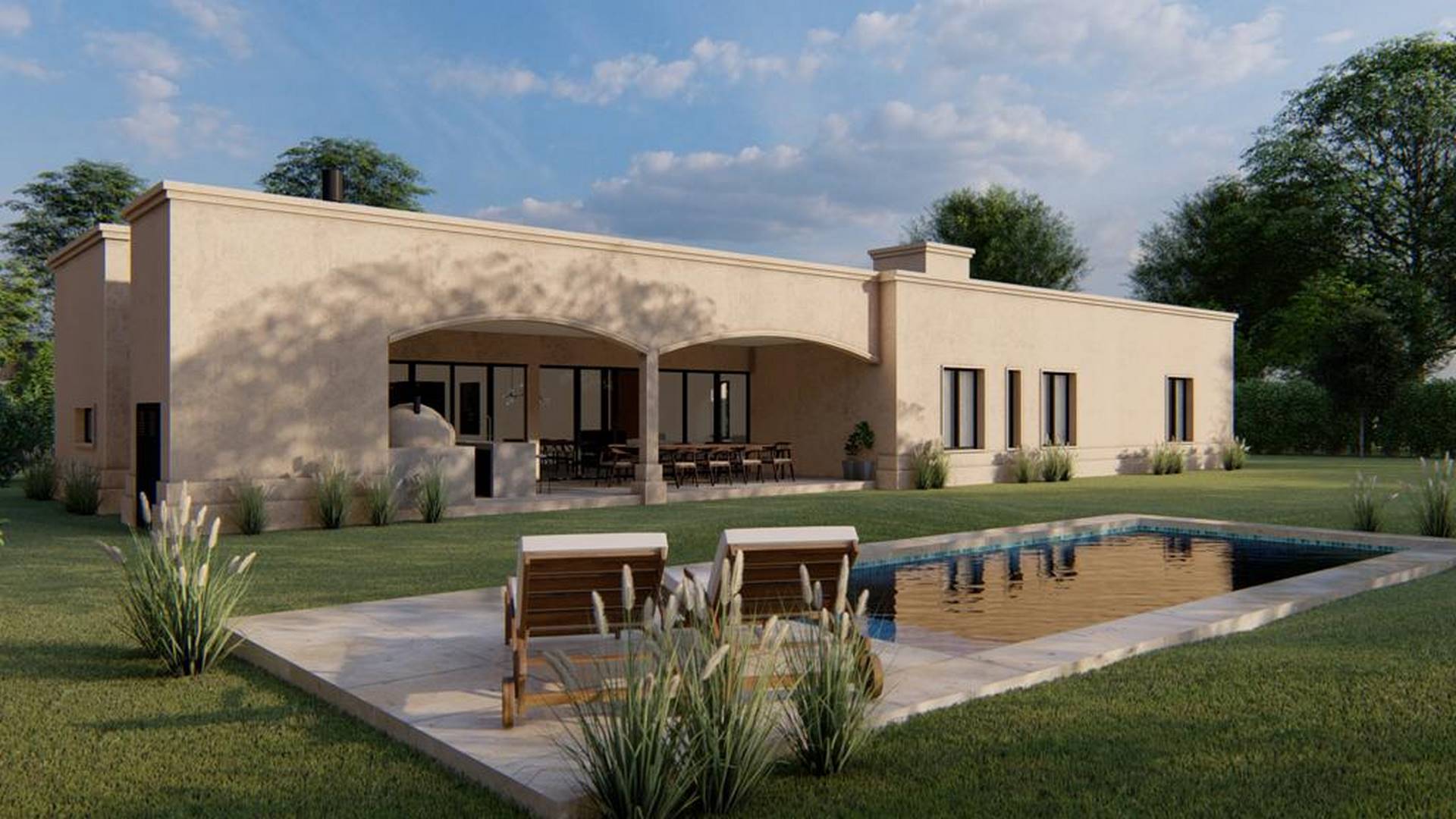 La zona de uso común se despliega en un espacio expansivo que incluye un hall de acceso con un toilette, un amplio living-comedor, una cocina funcional para el uso diario, un lavadero y una despensa. La conexión fluida entre el estar y el comedor se extiende hacia una galería envolvente, que se funde visualmente con la piscina y se integra con el generoso jardín que abraza la vivienda.