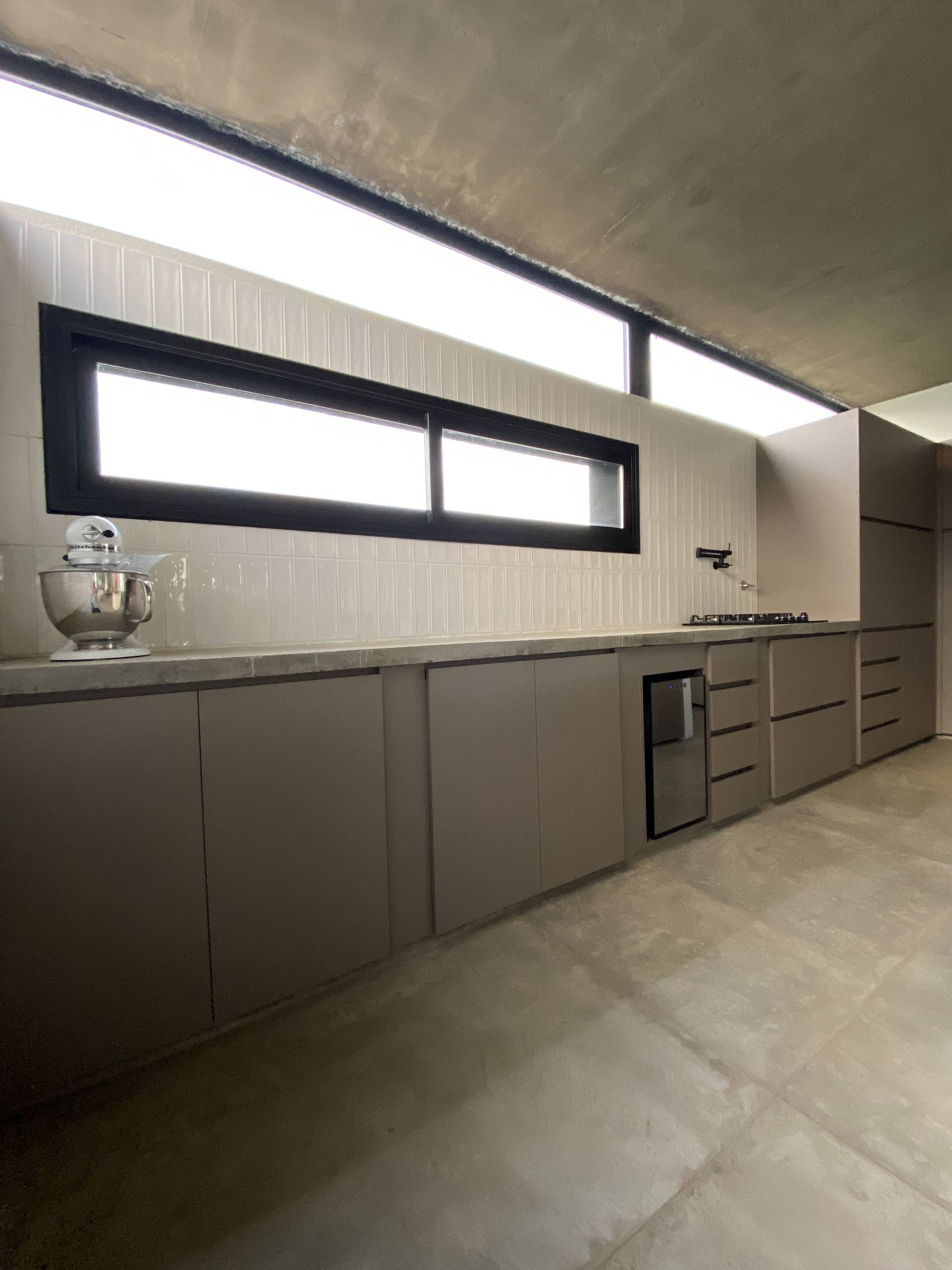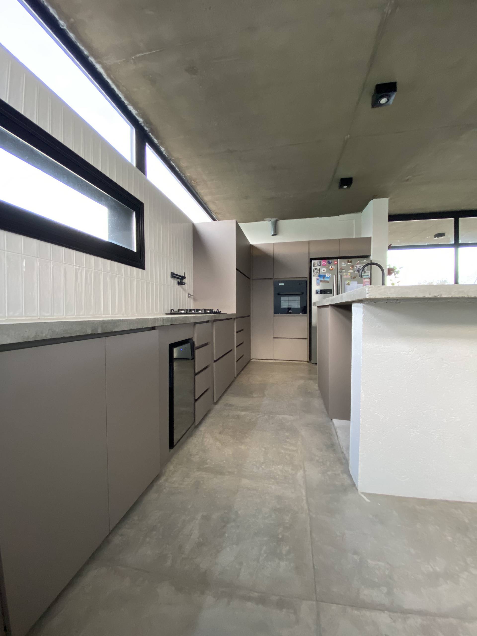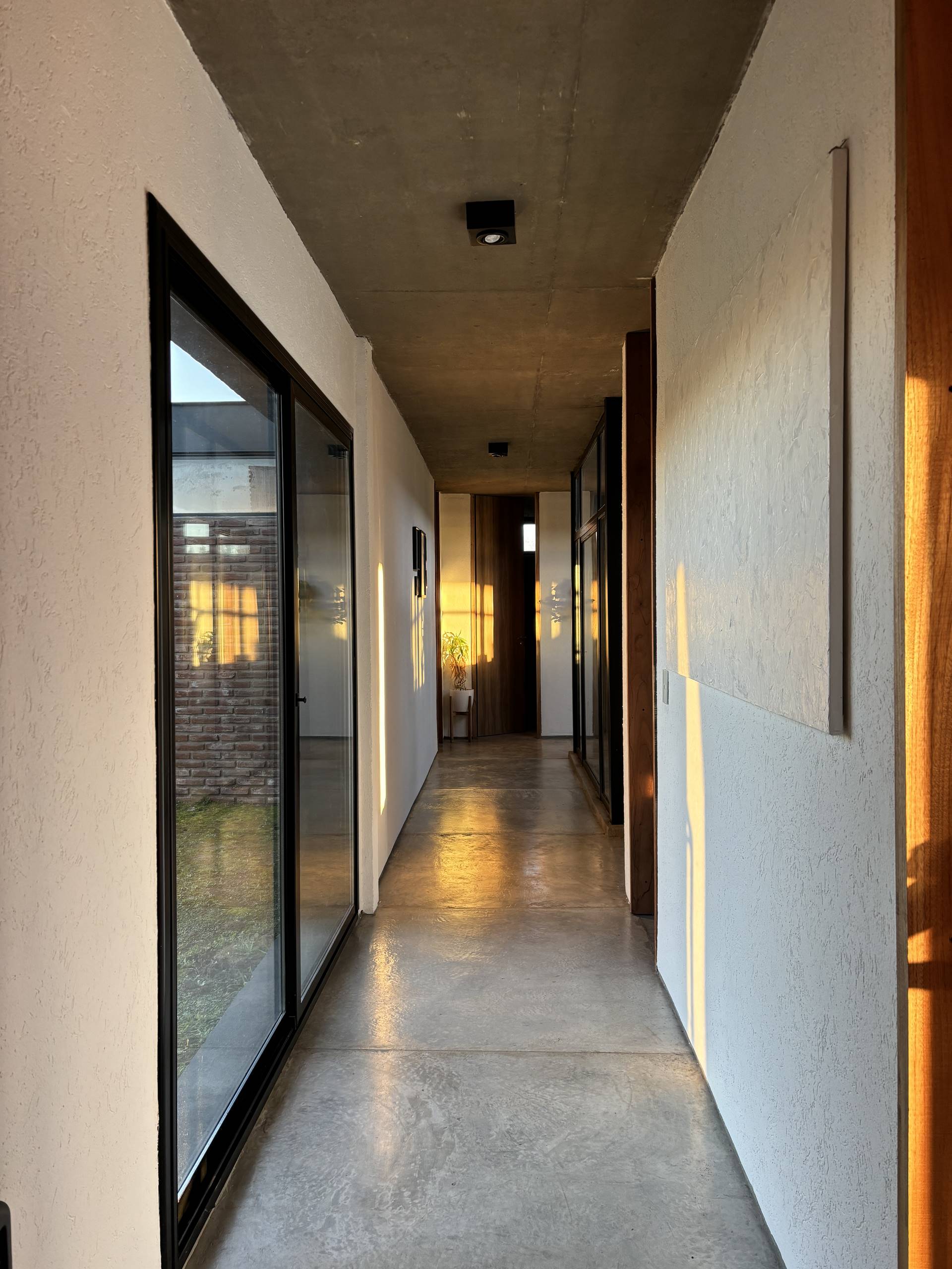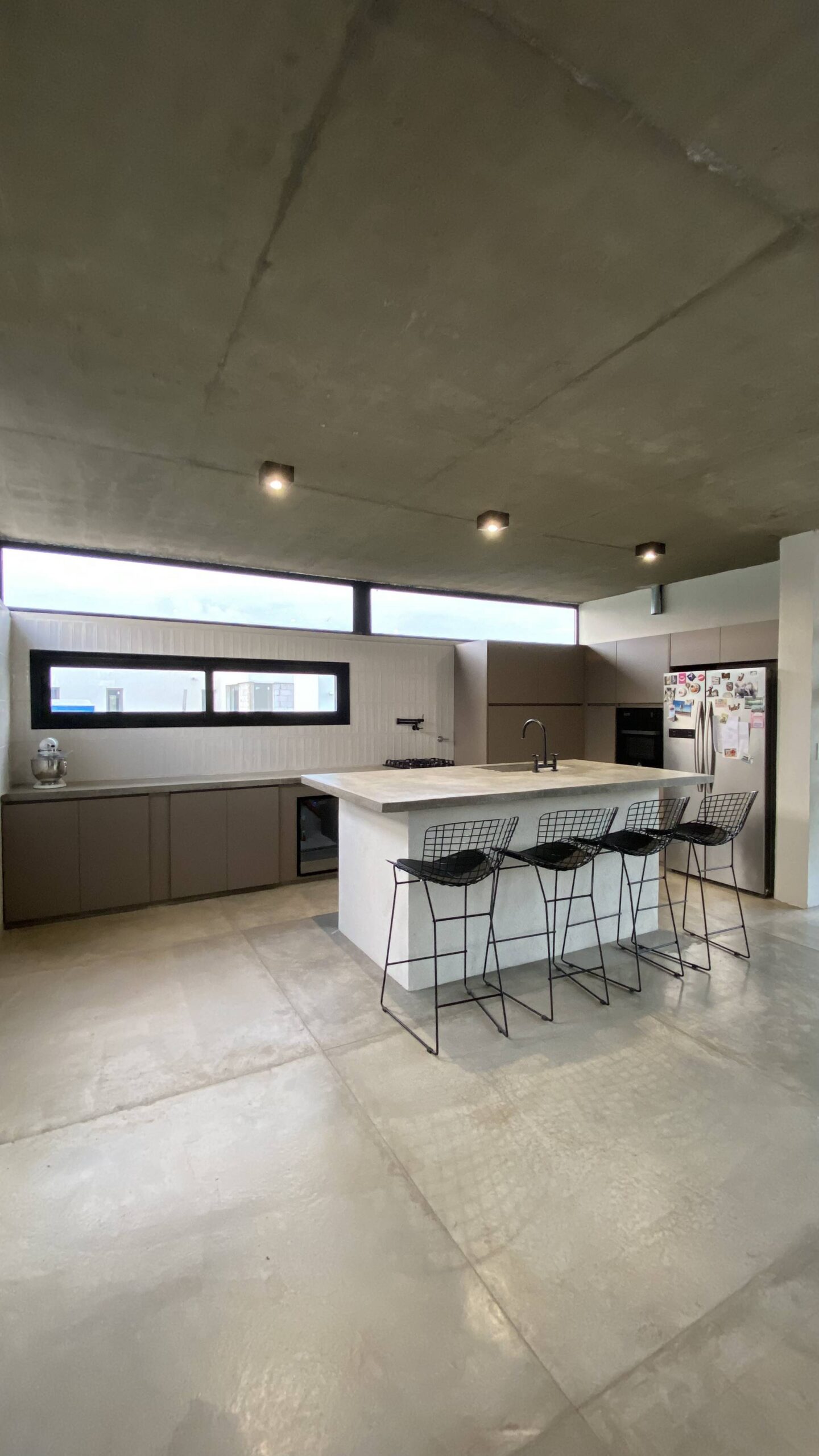 Las terminaciones interiores complementan el enfoque materialista del diseño con techos de hormigón visto, paredes blancas, solados de cemento alisado y ventanales de doble vidrio hermético, que garantizan una experiencia de vida luminosa, energéticamente eficiente y confortable.