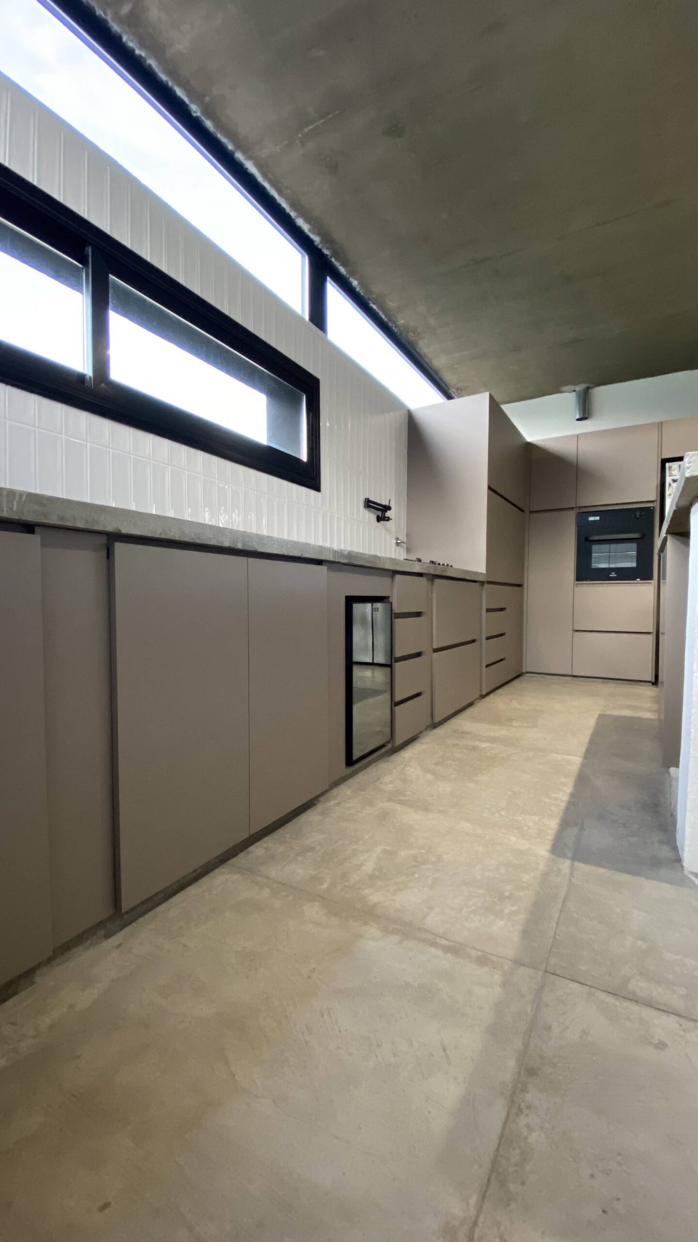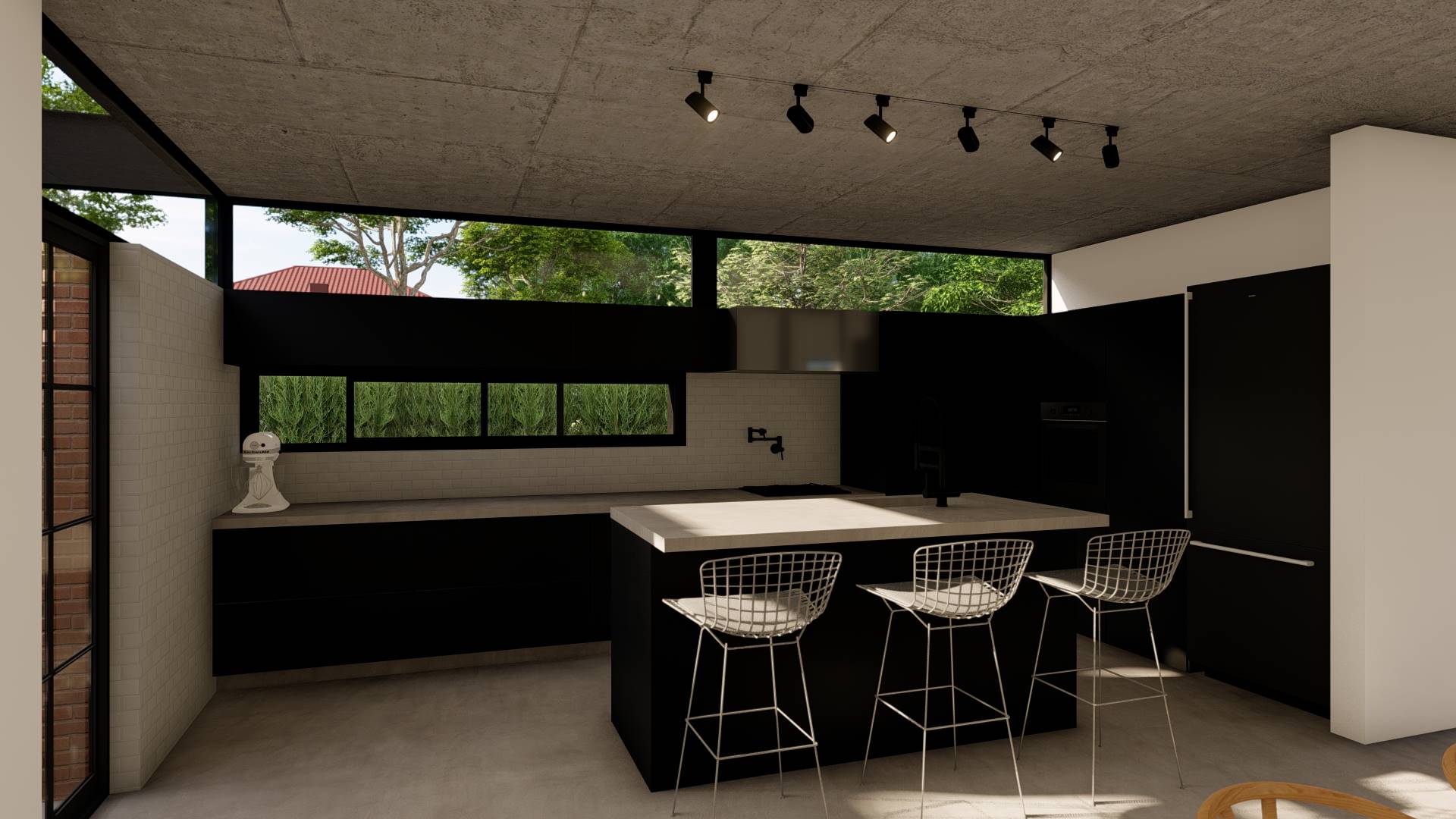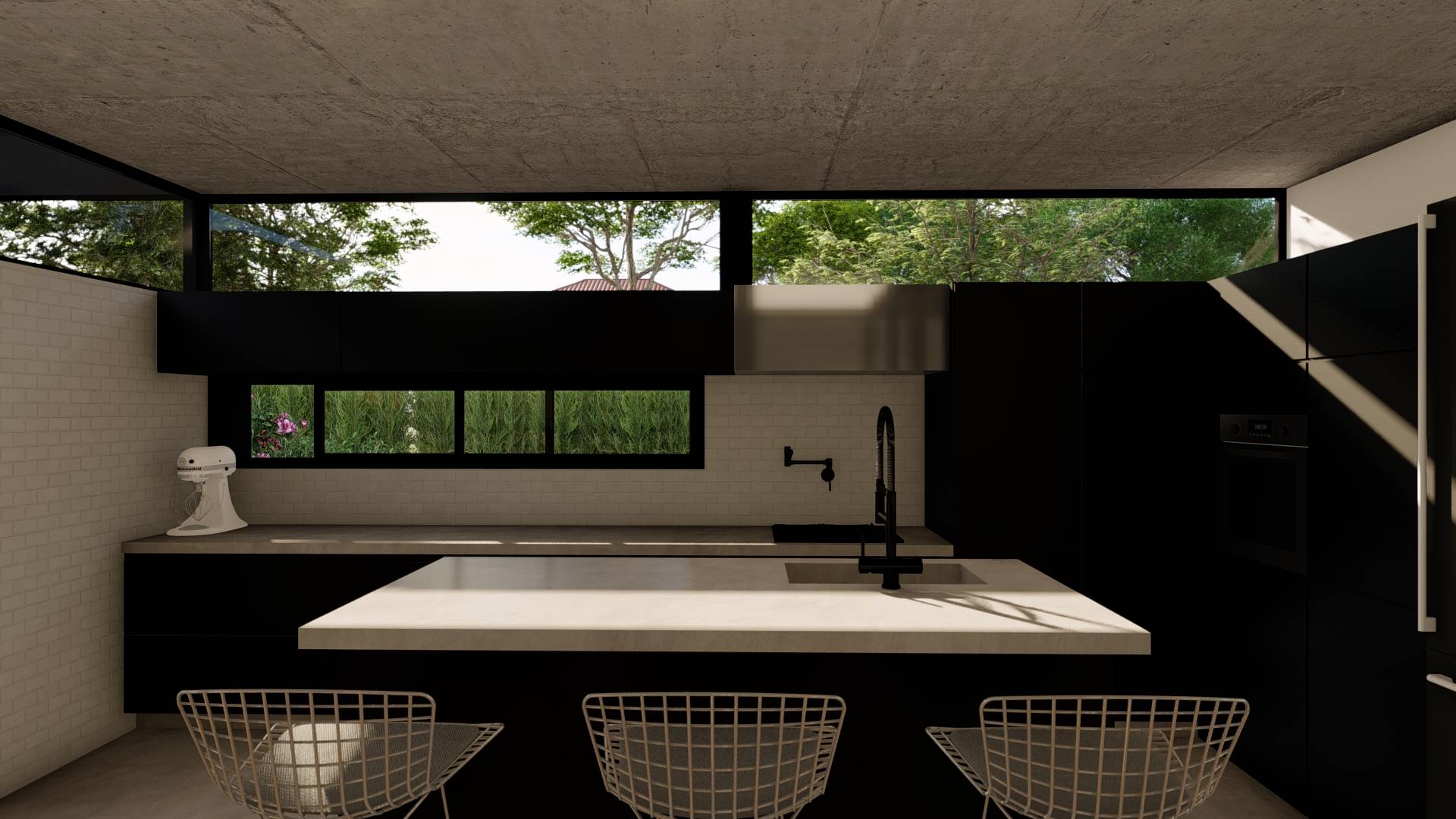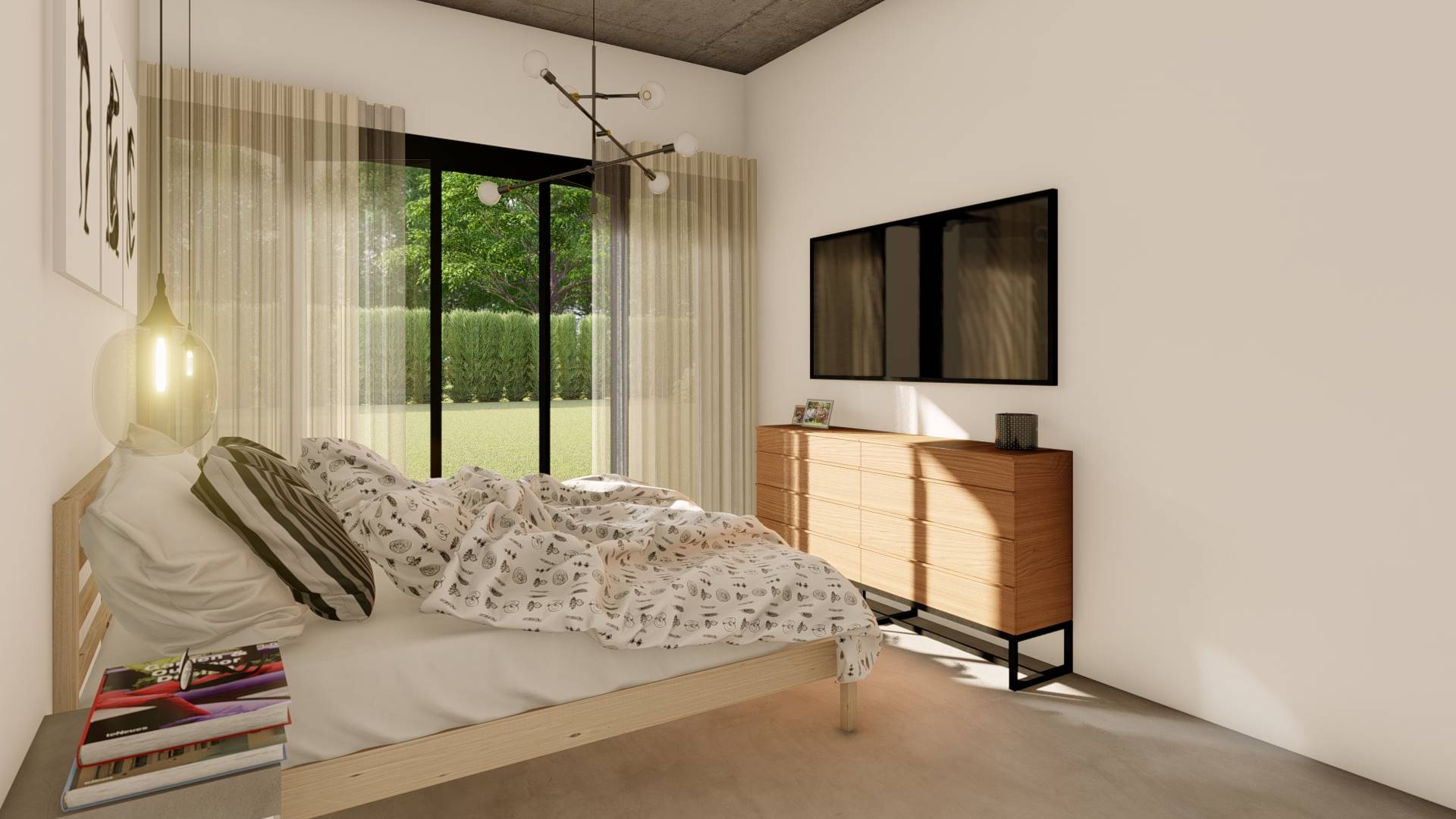 Las terminaciones interiores complementan el enfoque materialista del diseño con techos de hormigón visto, paredes blancas, solados de cemento alisado y ventanales de doble vidrio hermético, que garantizan una experiencia de vida luminosa, energéticamente eficiente y confortable.