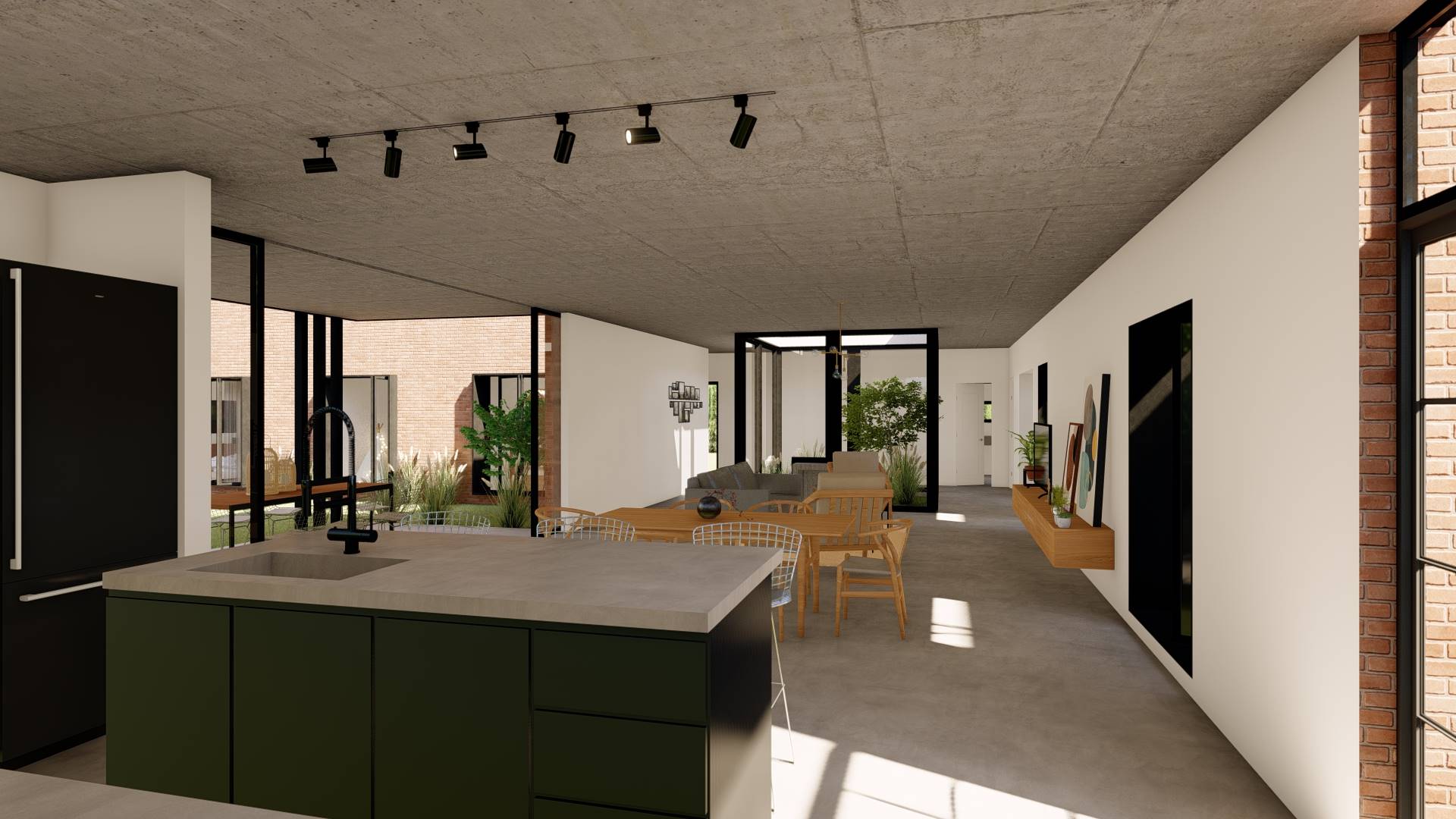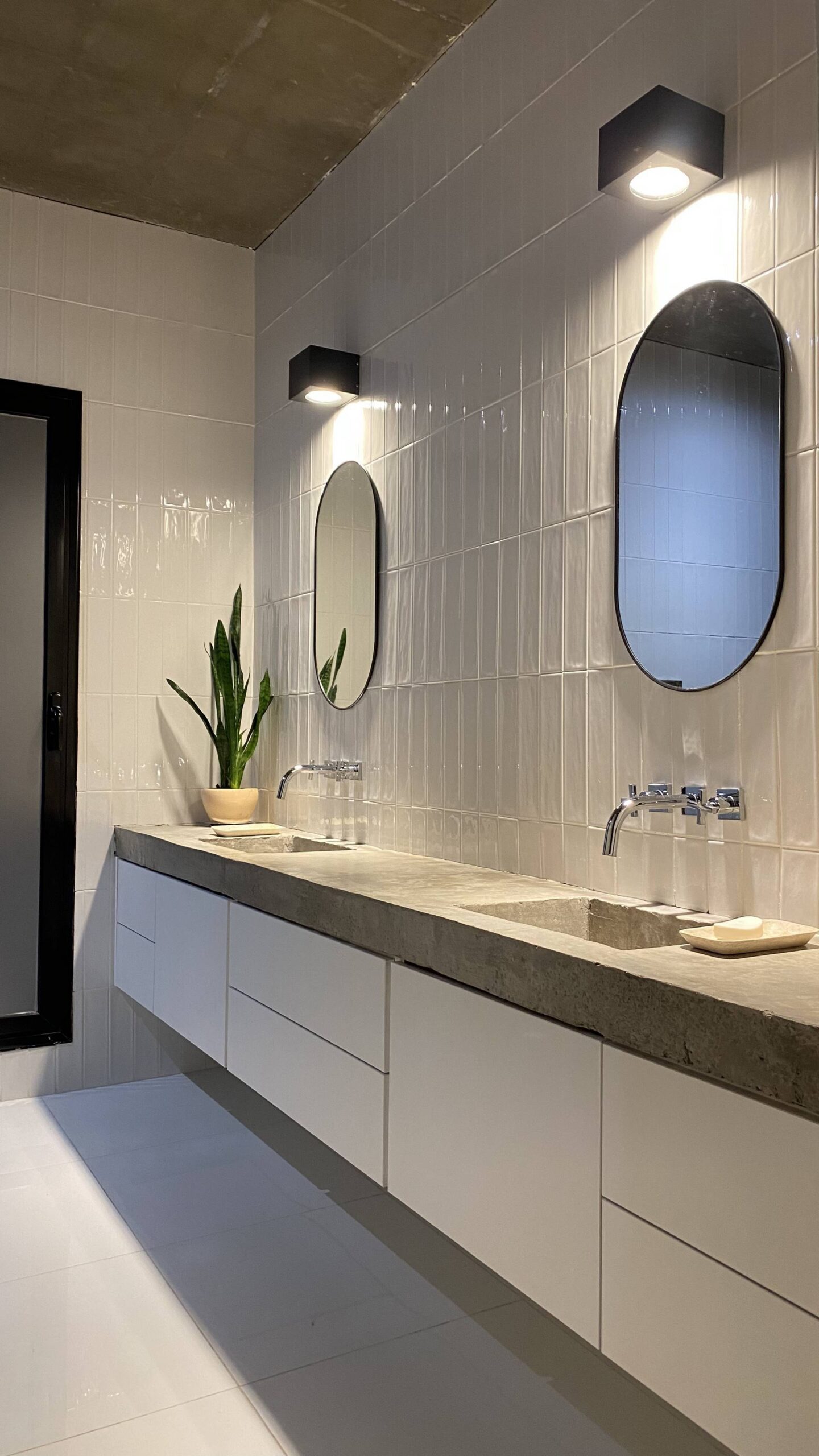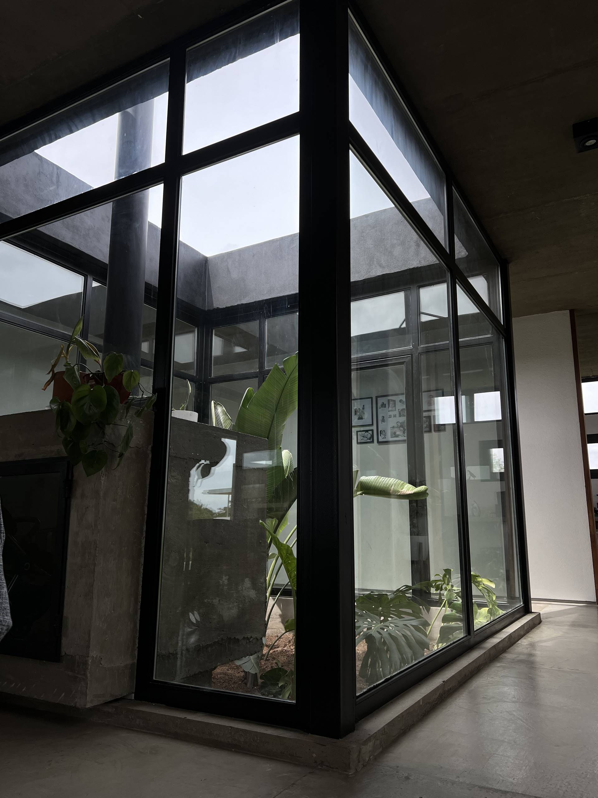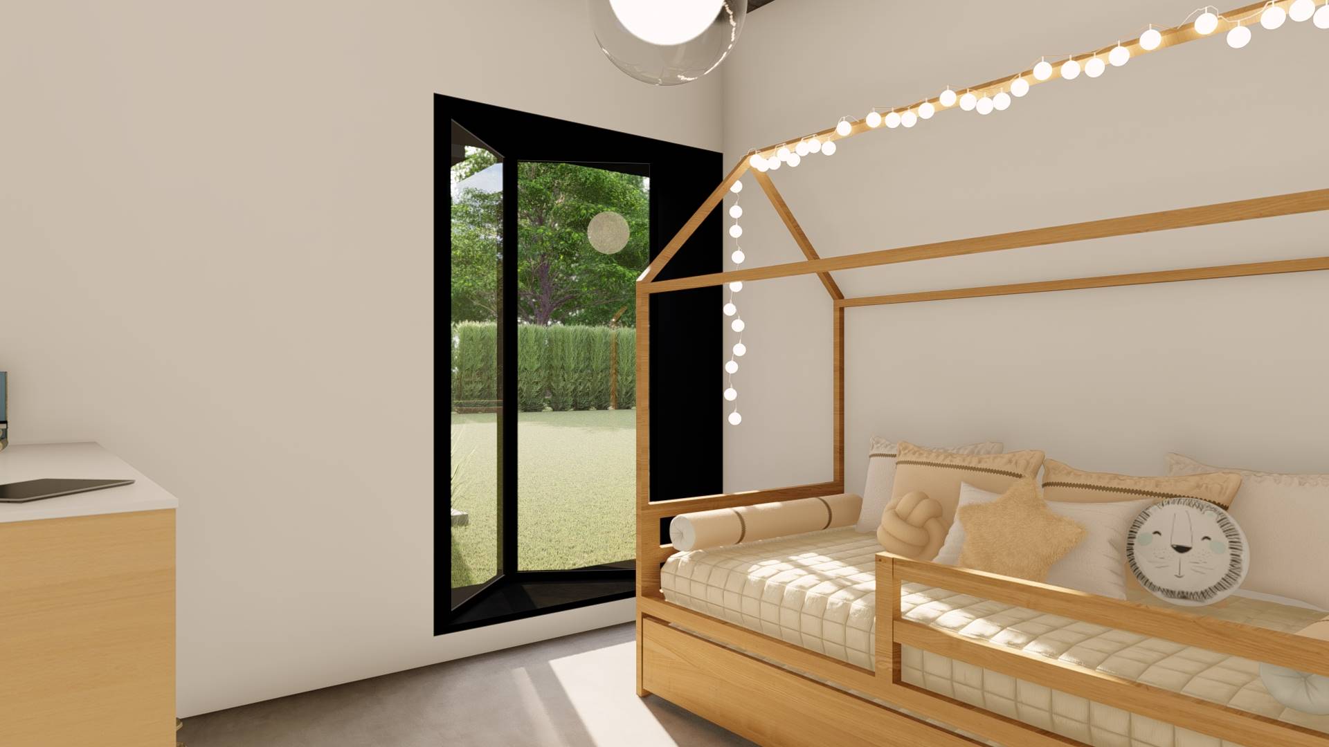 Las terminaciones interiores complementan el enfoque materialista del diseño con techos de hormigón visto, paredes blancas, solados de cemento alisado y ventanales de doble vidrio hermético, que garantizan una experiencia de vida luminosa, energéticamente eficiente y confortable.