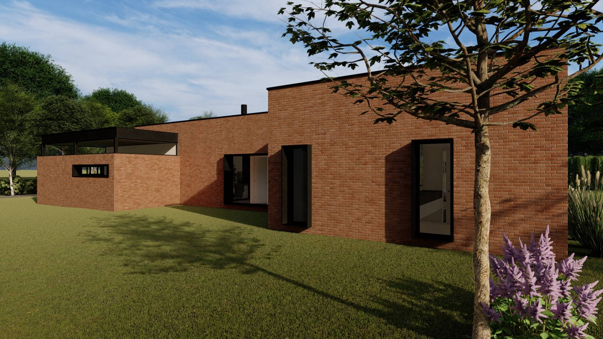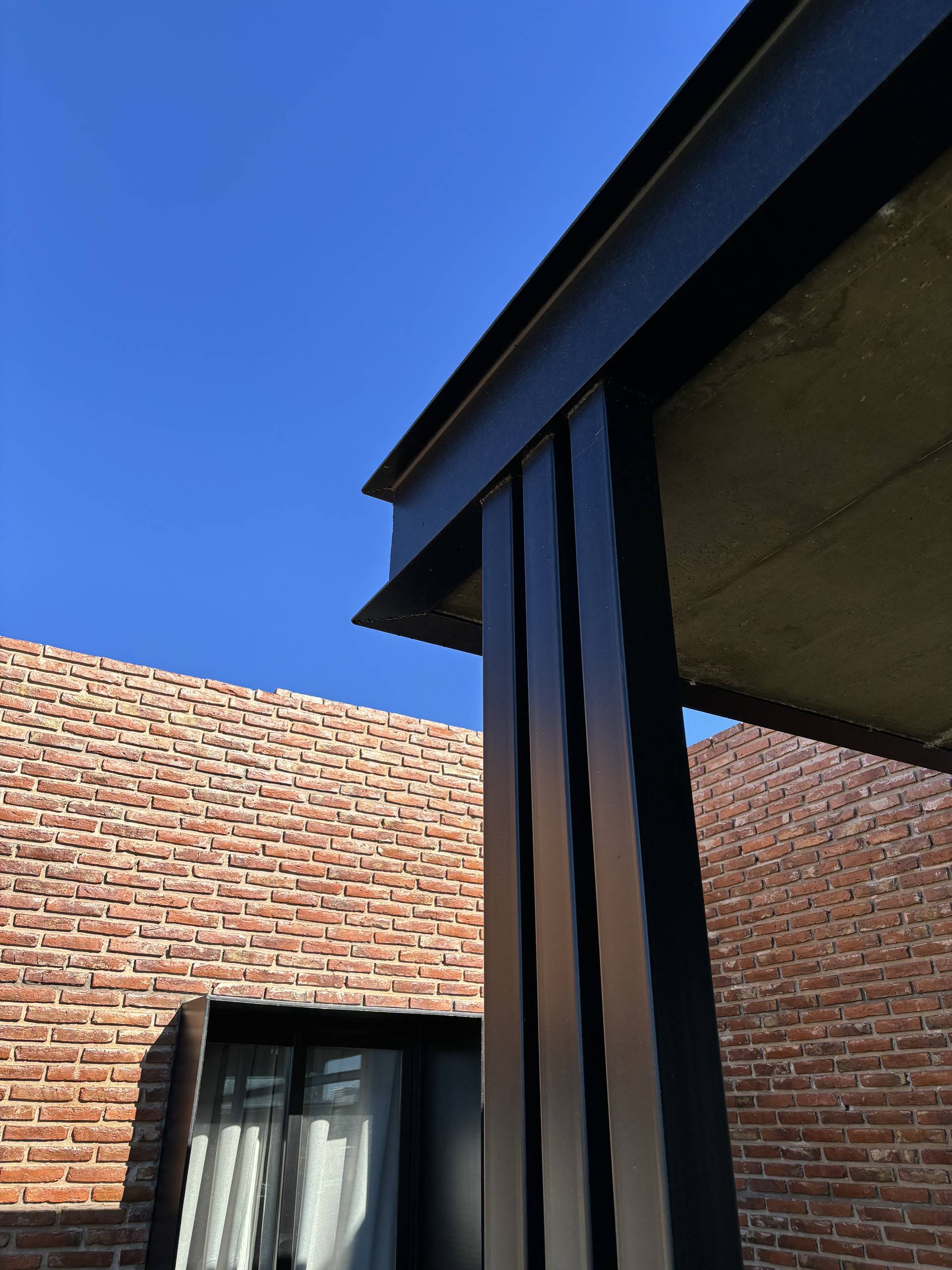 El diseño volumétrico de la vivienda juega con alturas variadas: un volumen central alto y macizo, revestido en ladrillo visto, contrasta con dos volúmenes laterales más bajos que presentan ventanales estratégicamente colocados en su parte superior permitiendo que la luz ingrese al interior. Una elegante viga de acero recorre el perímetro, en una forma de cinta que une y define los espacios arquitectónicos.