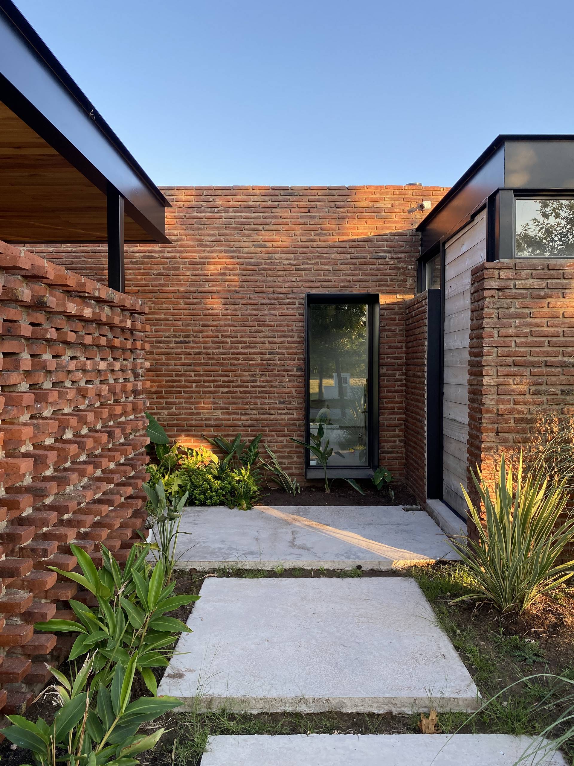 La estructura principal, de hormigón armado, se encuentra embebida en una envoltura de muros dobles de ladrillo, que no solo definen su carácter estético, sino que también optimizan el rendimiento térmico. El ladrillo común, expuesto en su forma más rústica en la fachada, contrasta con el ladrillo hueco revocado en el interior. Esta dualidad crea una cámara de aire que actúa como aislante térmico, mejorando las condiciones ambientales y aportando una sensación de confort a los espacios interiores manteniendo la frescura en el calor del verano y la calidez en el invierno.