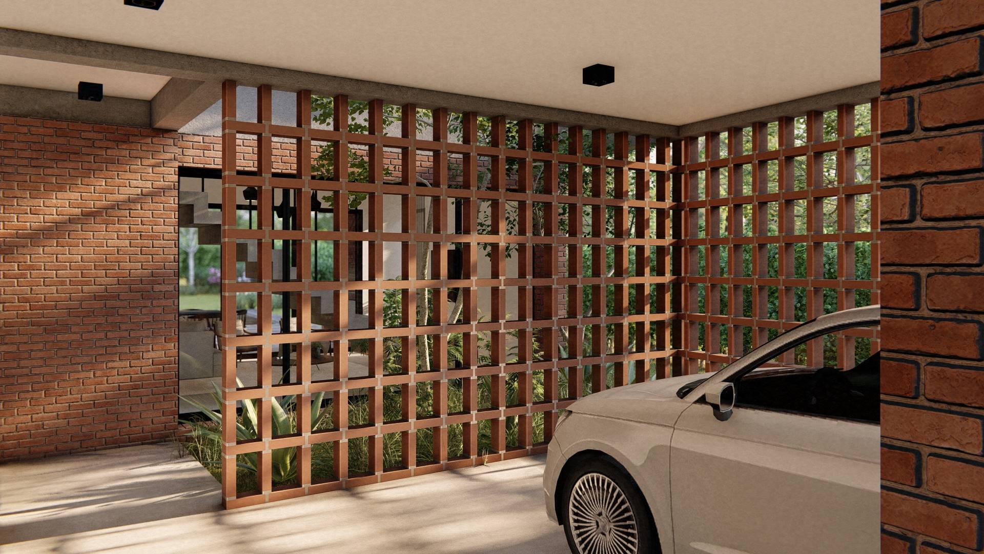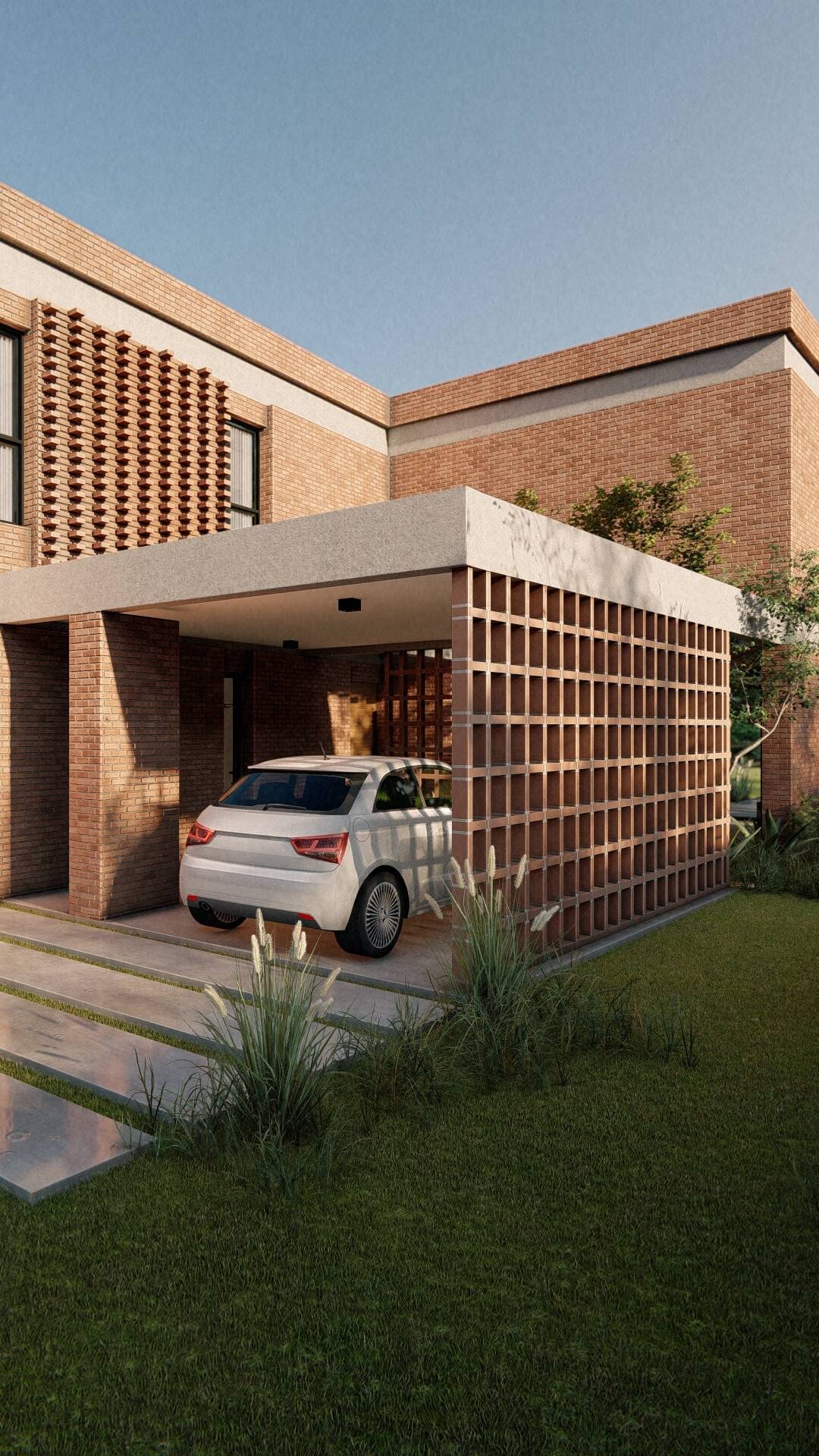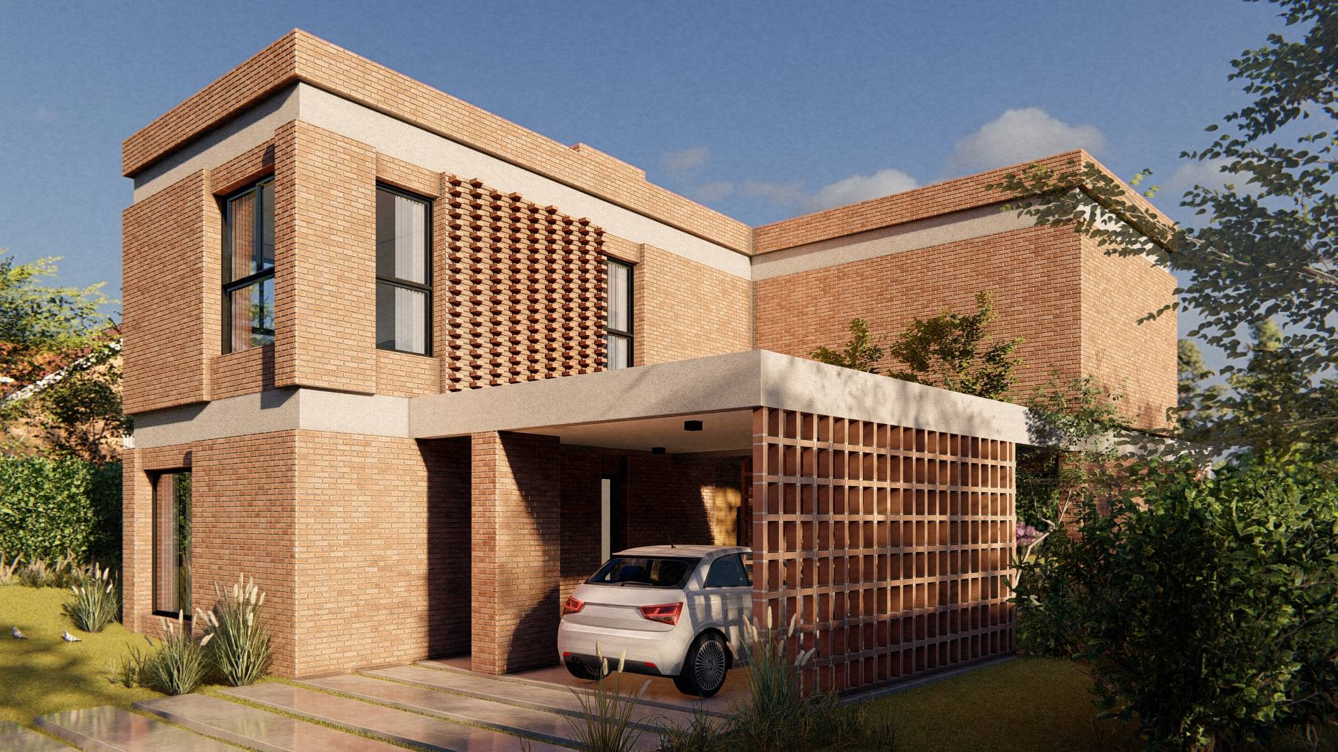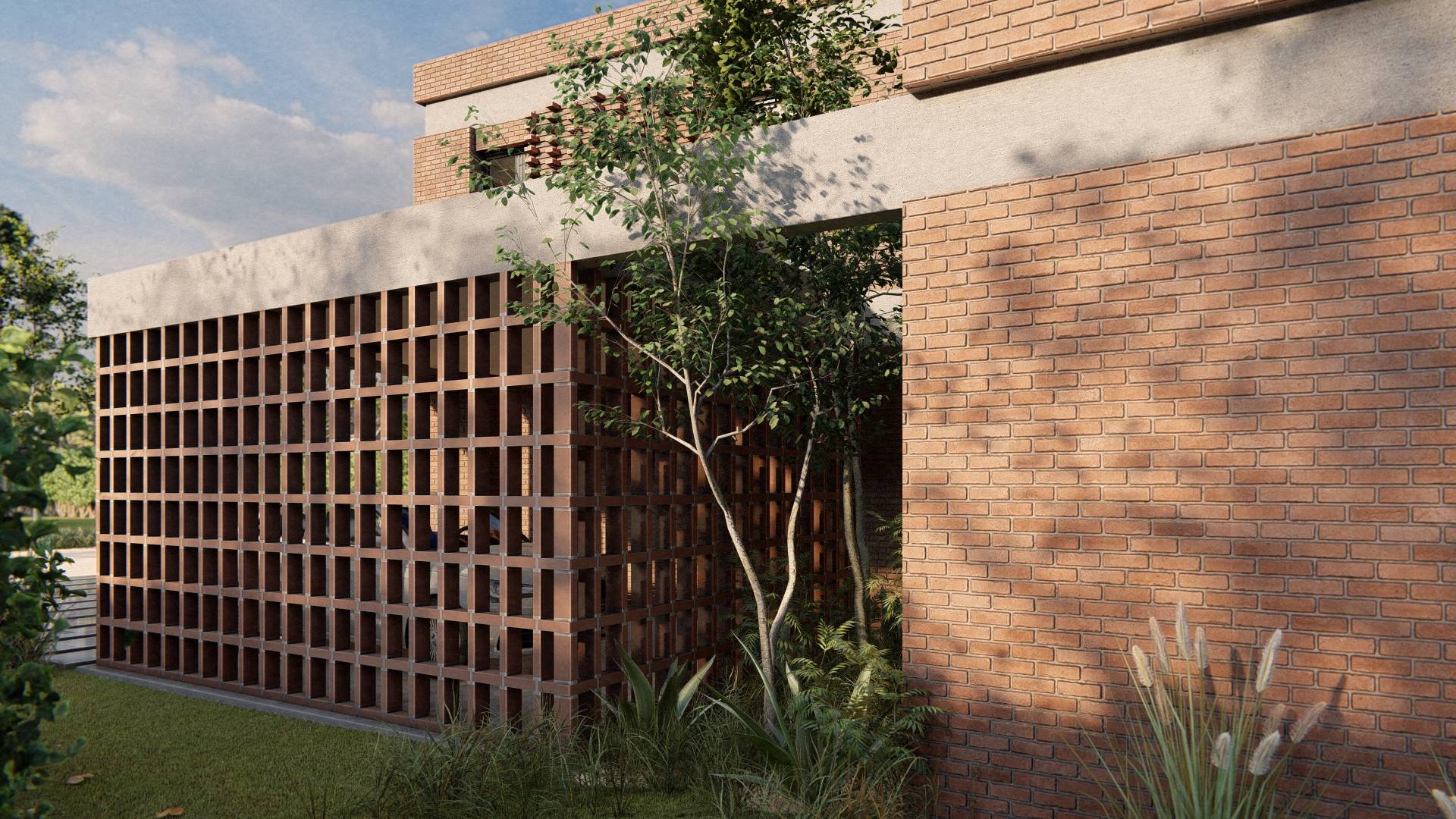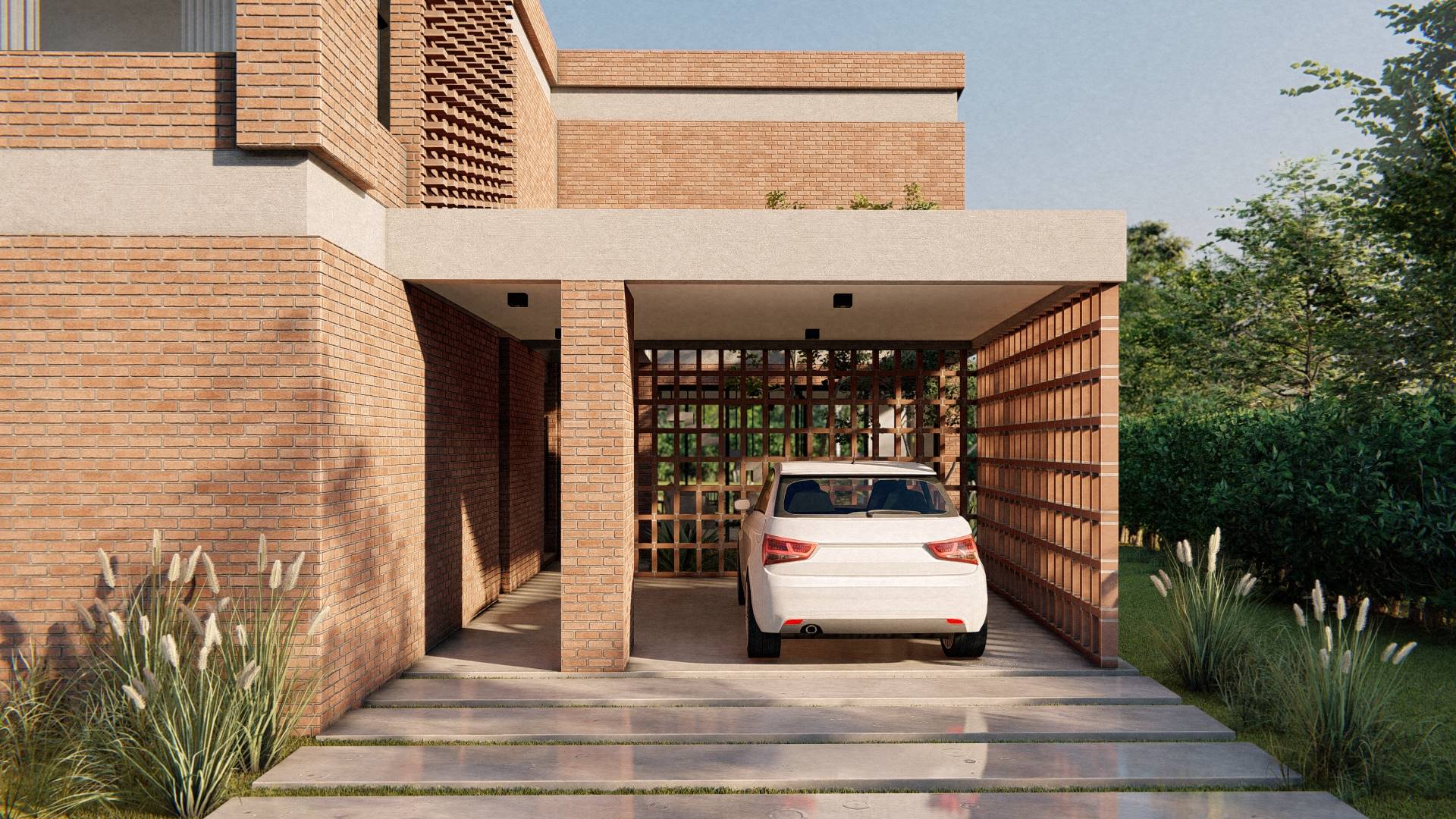 Nuestro enfoque en la modulación espacial no solo aporta orden y armonía al diseño, sino que también optimiza el uso de los materiales. Hemos optado por trabajar el ladrillo en su estado más puro, combinándolo con bloques cerámicos en el interior para formar un muro doble que mejora la eficacia térmica de la vivienda. La estructura, imponente en su robustez, sostiene los pesados muros de ladrillo de la fachada, mientras que el hormigón visto subraya su carácter monumental. Además, los entramados de ladrillo estratégicamente dispuestos permiten un juego de luces y sombras que filtra la luz solar y proporciona privacidad en el acceso semicubierto, realzando la plasticidad del material.