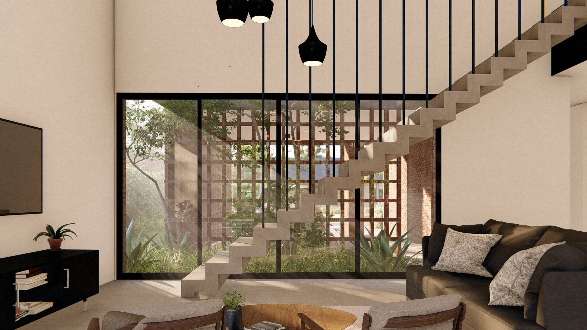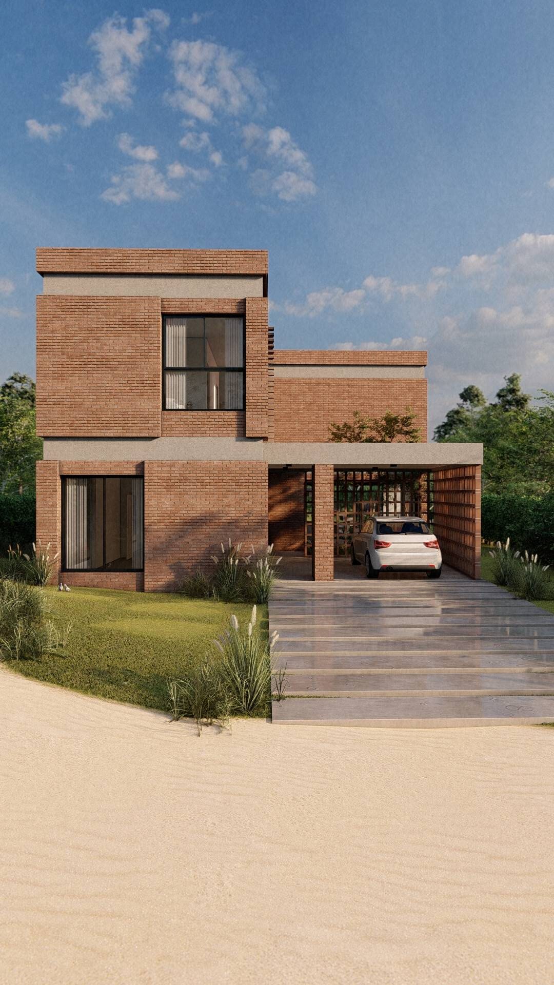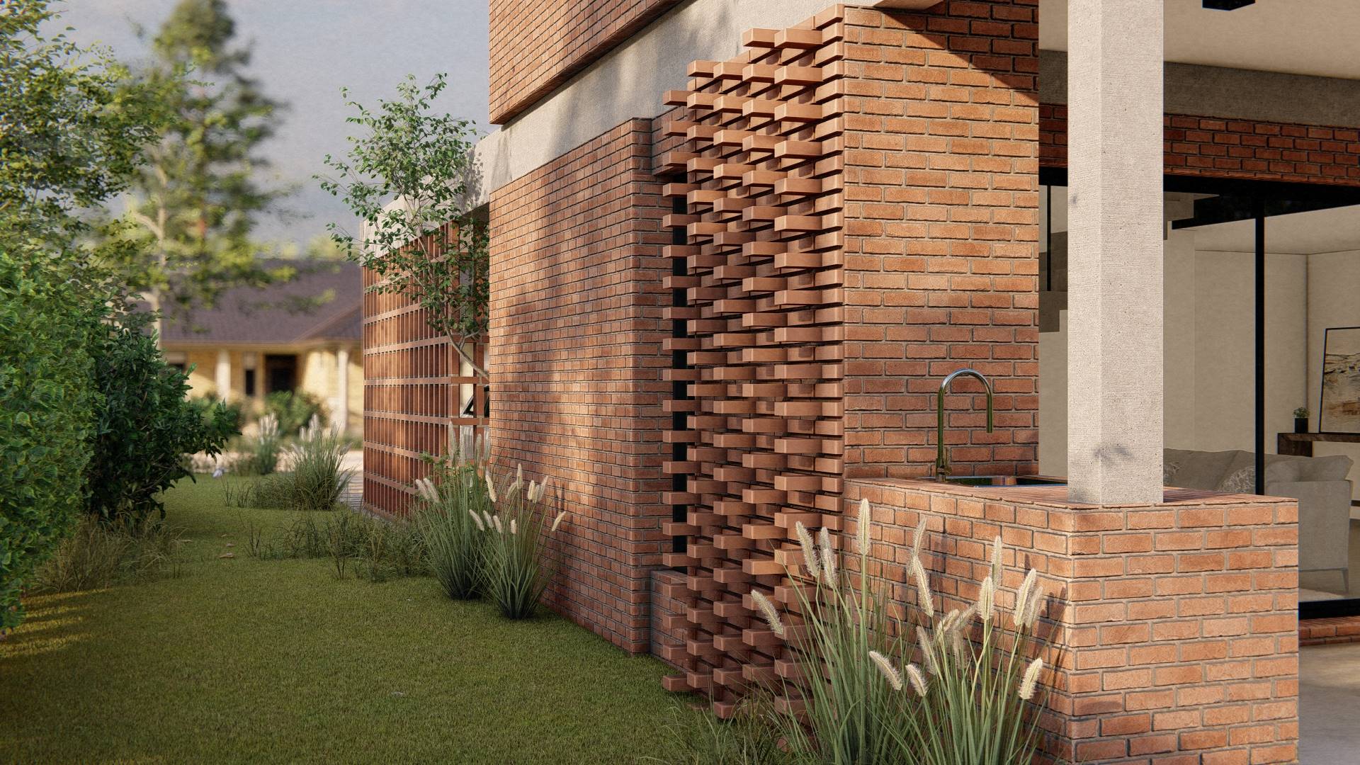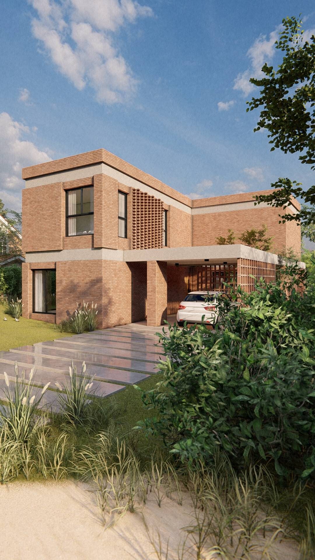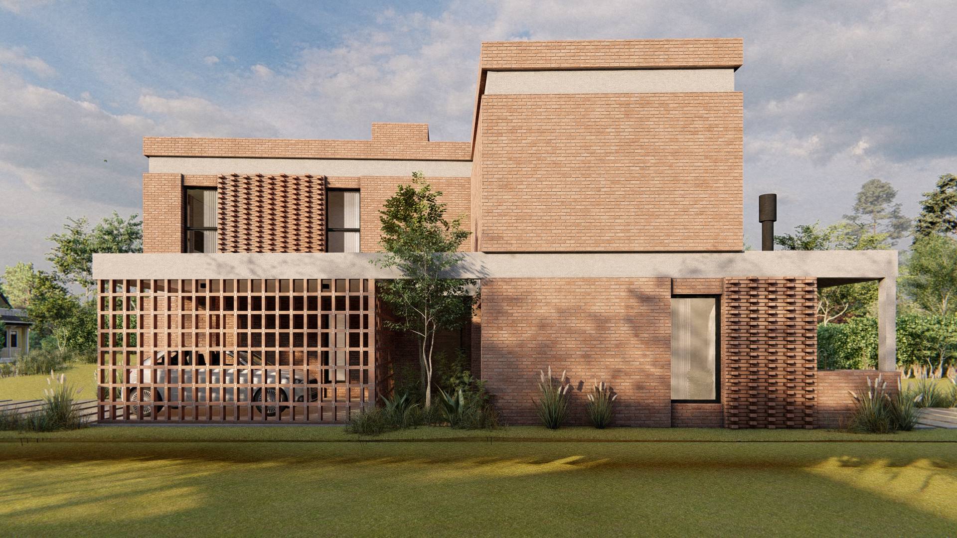 Nuestro enfoque en la modulación espacial no solo aporta orden y armonía al diseño, sino que también optimiza el uso de los materiales. Hemos optado por trabajar el ladrillo en su estado más puro, combinándolo con bloques cerámicos en el interior para formar un muro doble que mejora la eficacia térmica de la vivienda. La estructura, imponente en su robustez, sostiene los pesados muros de ladrillo de la fachada, mientras que el hormigón visto subraya su carácter monumental. Además, los entramados de ladrillo estratégicamente dispuestos permiten un juego de luces y sombras que filtra la luz solar y proporciona privacidad en el acceso semicubierto, realzando la plasticidad del material.