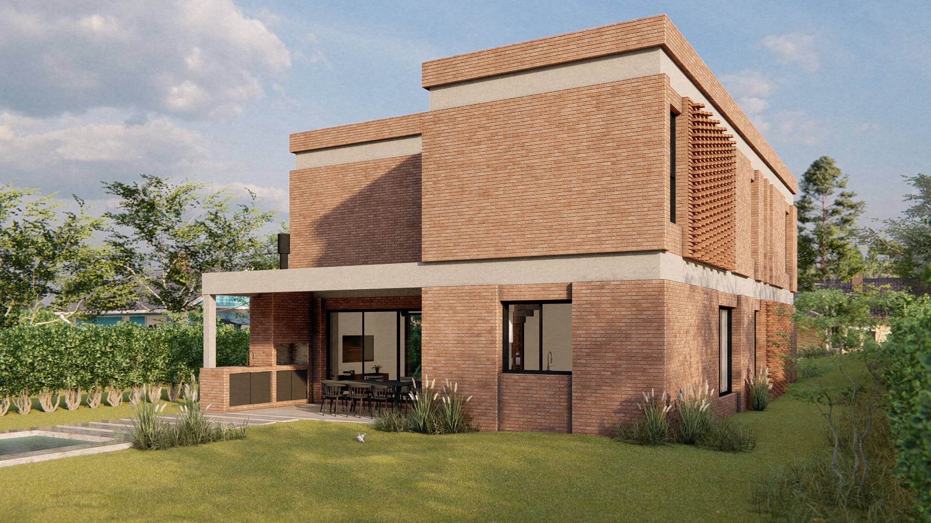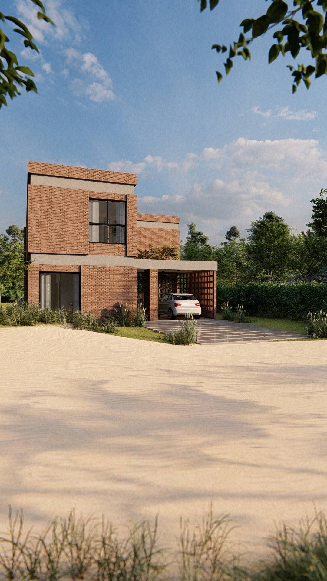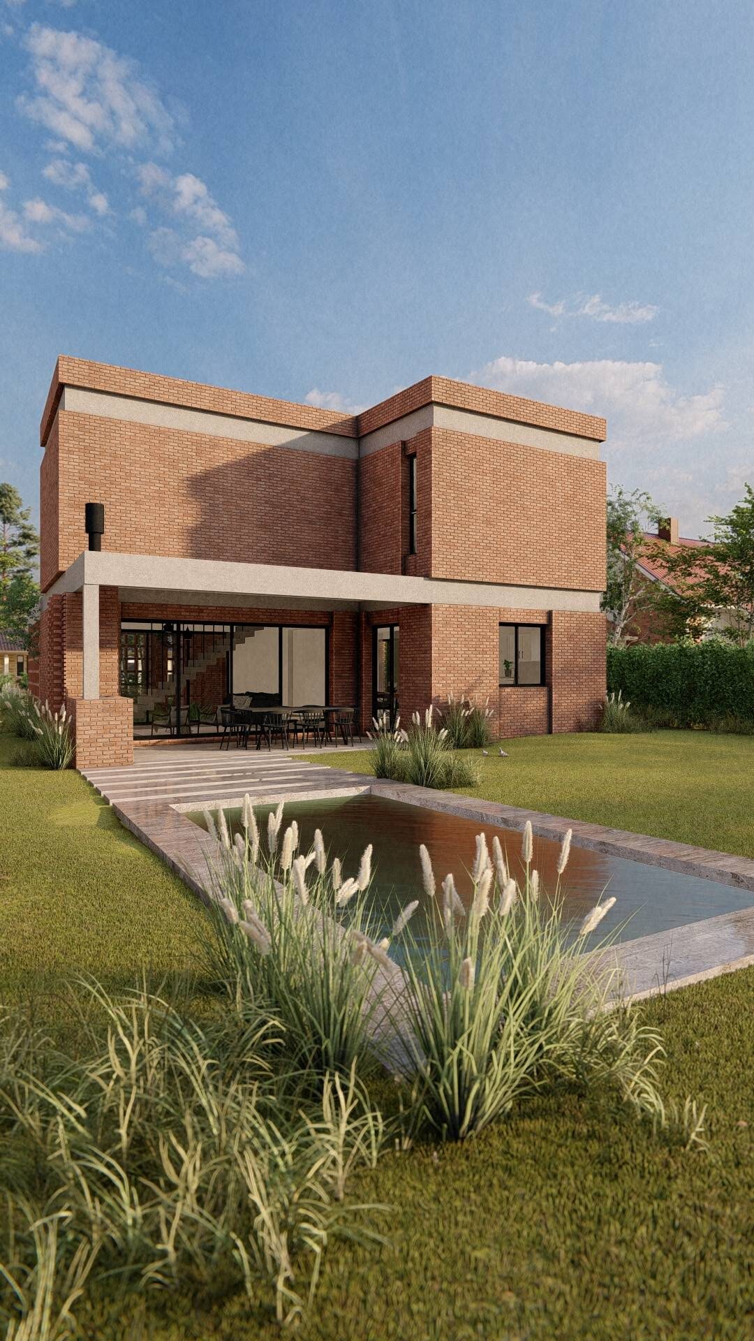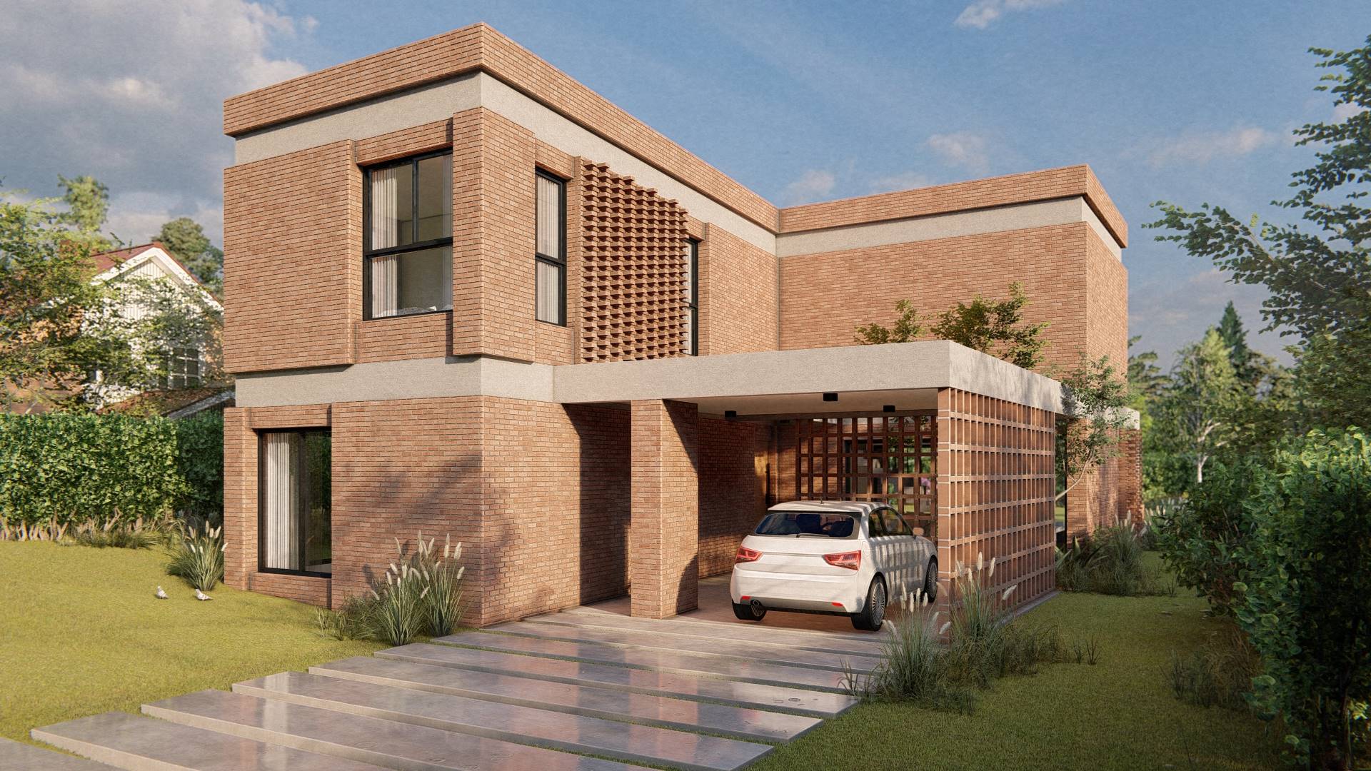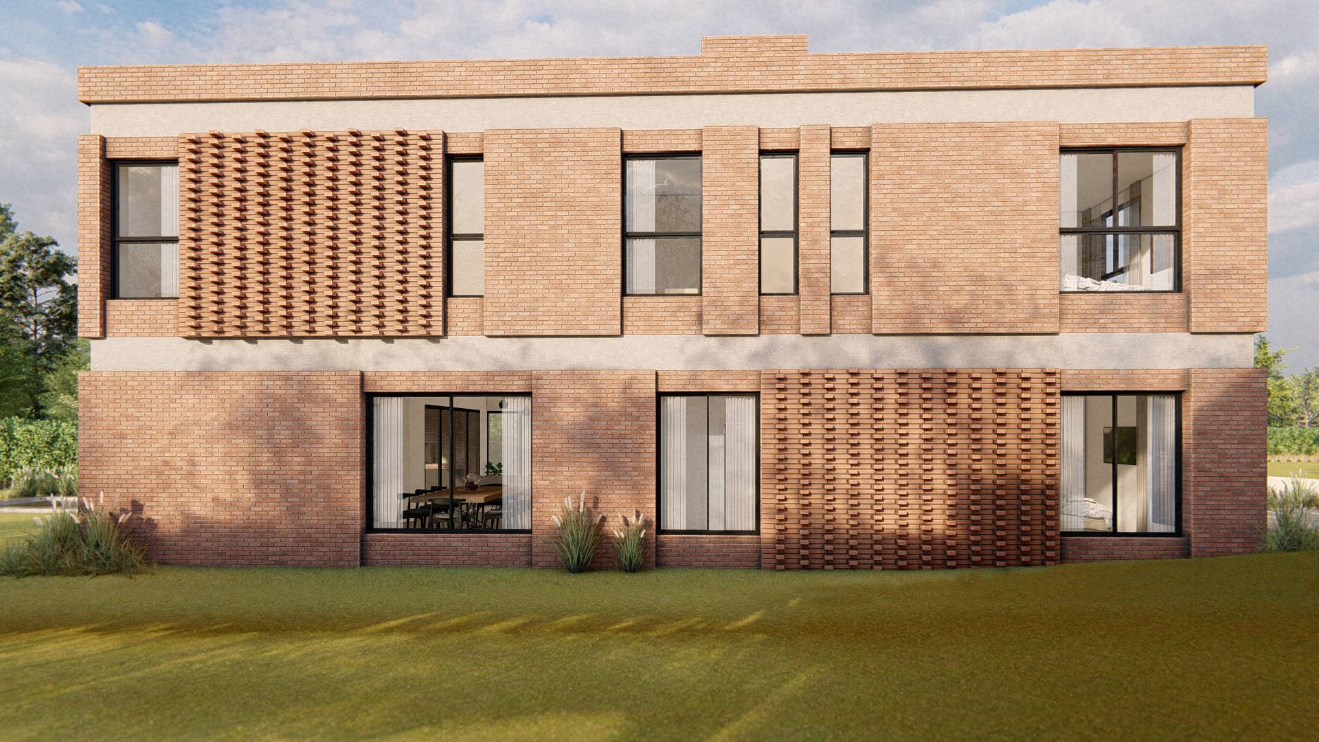 Nuestro enfoque en la modulación espacial no solo aporta orden y armonía al diseño, sino que también optimiza el uso de los materiales. Hemos optado por trabajar el ladrillo en su estado más puro, combinándolo con bloques cerámicos en el interior para formar un muro doble que mejora la eficacia térmica de la vivienda. La estructura, imponente en su robustez, sostiene los pesados muros de ladrillo de la fachada, mientras que el hormigón visto subraya su carácter monumental. Además, los entramados de ladrillo estratégicamente dispuestos permiten un juego de luces y sombras que filtra la luz solar y proporciona privacidad en el acceso semicubierto, realzando la plasticidad del material.