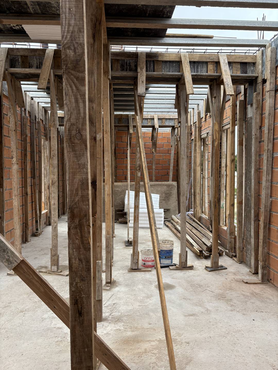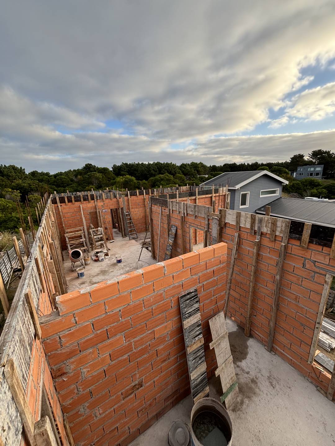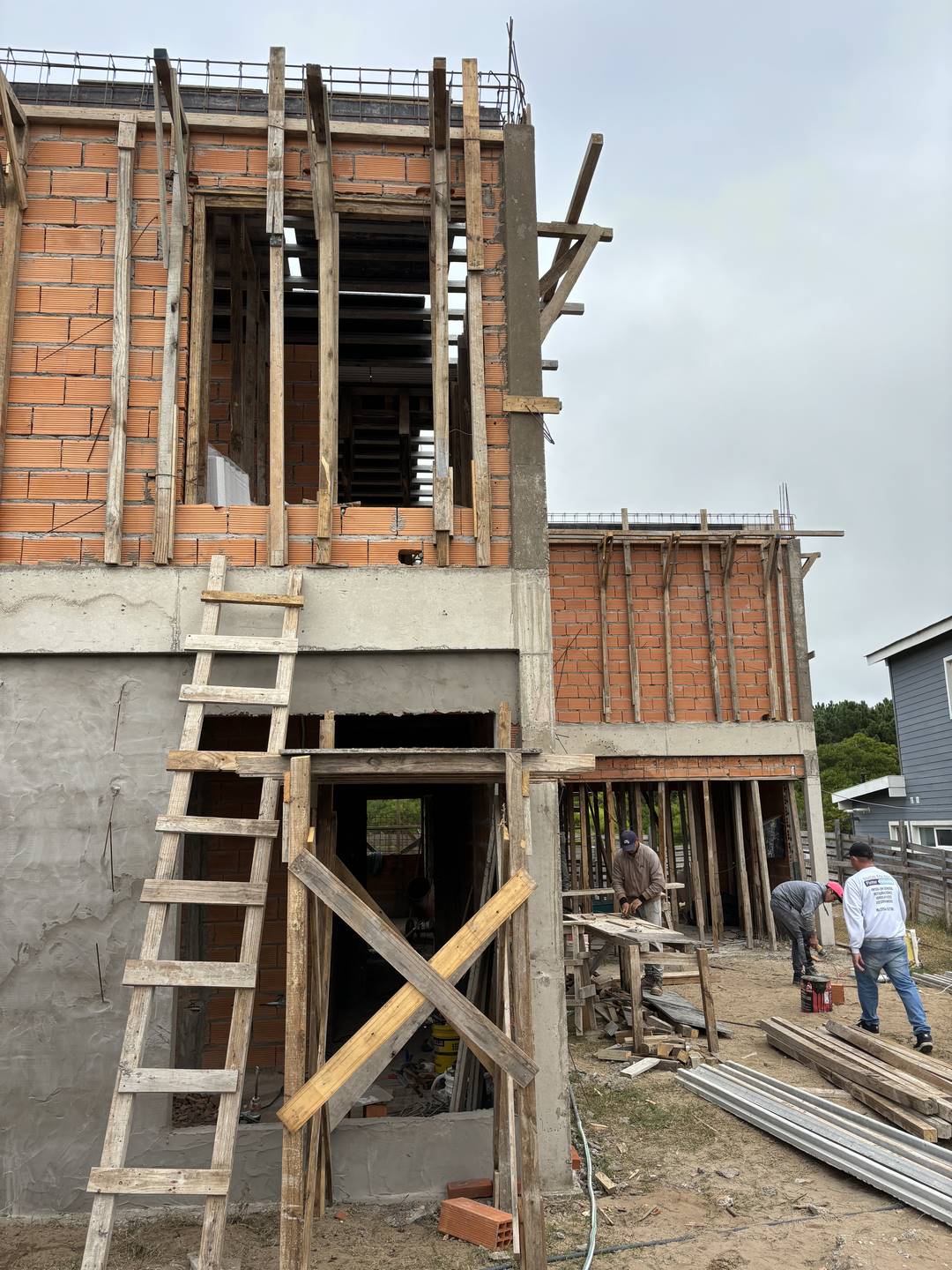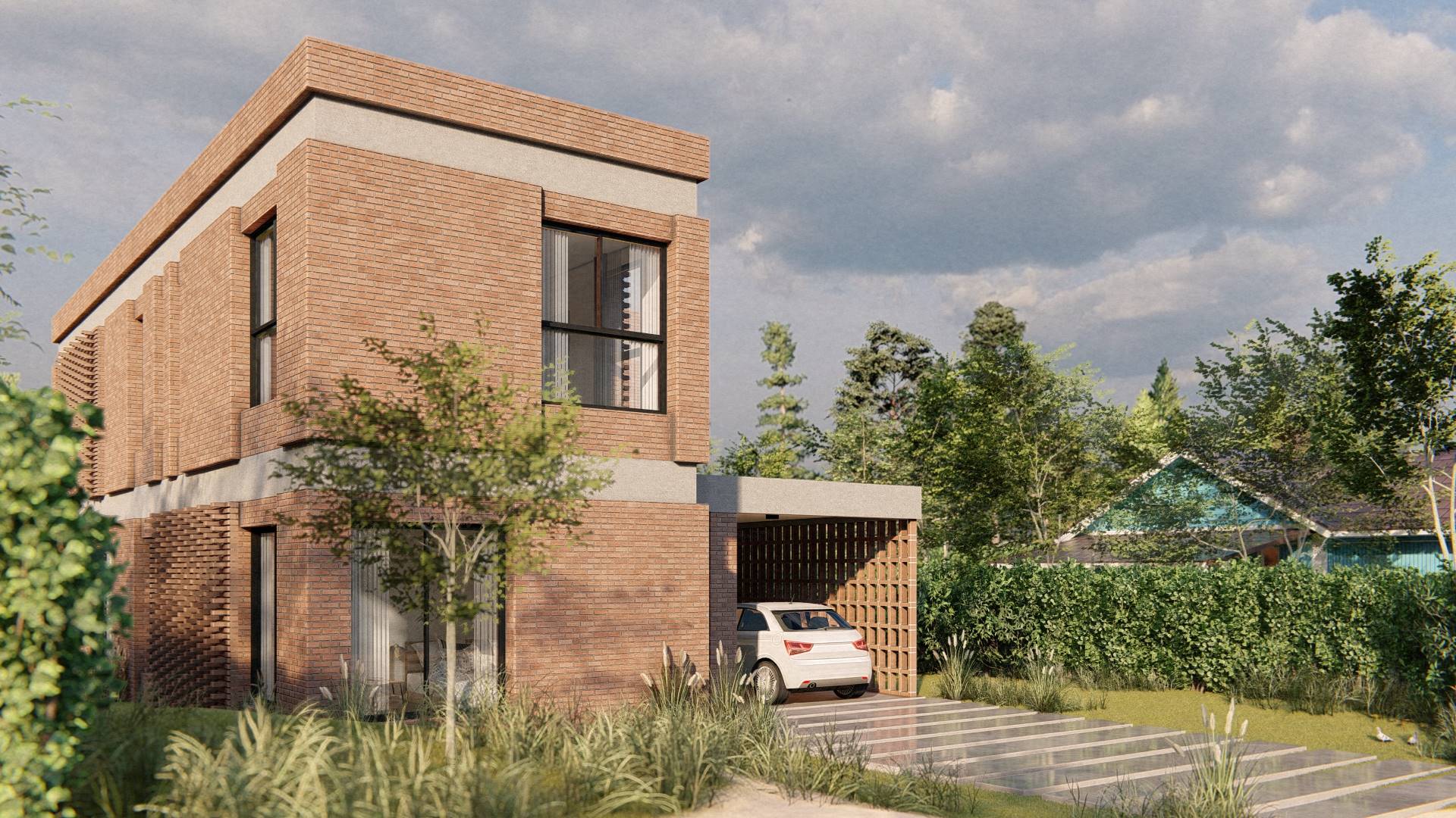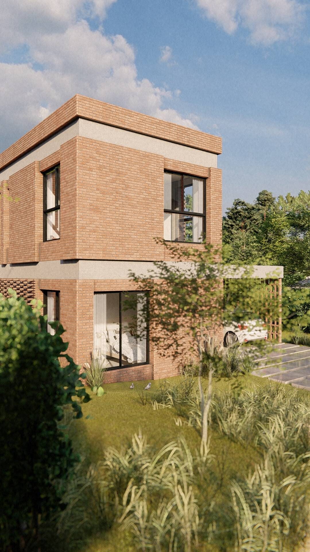 Nuestro enfoque en la modulación espacial no solo aporta orden y armonía al diseño, sino que también optimiza el uso de los materiales. Hemos optado por trabajar el ladrillo en su estado más puro, combinándolo con bloques cerámicos en el interior para formar un muro doble que mejora la eficacia térmica de la vivienda. La estructura, imponente en su robustez, sostiene los pesados muros de ladrillo de la fachada, mientras que el hormigón visto subraya su carácter monumental. Además, los entramados de ladrillo estratégicamente dispuestos permiten un juego de luces y sombras que filtra la luz solar y proporciona privacidad en el acceso semicubierto, realzando la plasticidad del material.