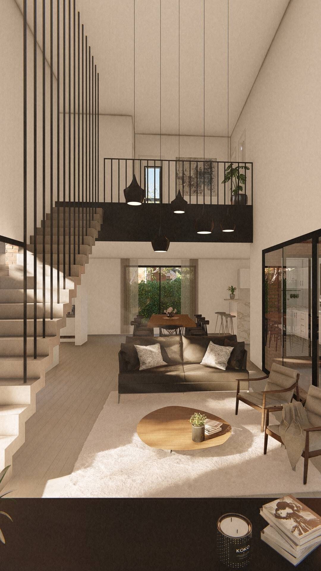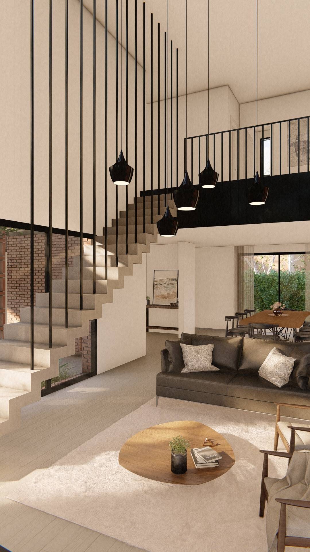 El acceso semicubierto actúa como una transición suave entre el exterior natural y el interior acogedor de la vivienda, estableciendo un umbral que prepara al visitante para la experiencia de inmersión en un entorno de tranquilidad. Este acceso conduce a un living de doble altura, un espacio que no solo eleva la percepción espacial, sino que también establece un vínculo fluido con el comedor y la cocina. Estos espacios, a su vez, se abren hacia una amplia galería equipada con parrilla, extendiendo el área de reunión hacia el exterior.